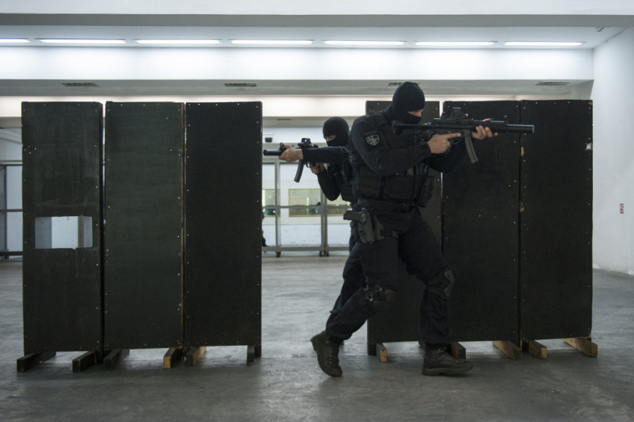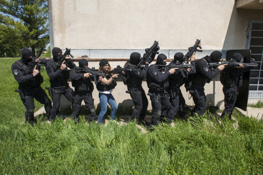 S puškom sam se kako-tako izborila i kvalifikovala se za prvu vežbu - dejstvo protiv terorista u gradskoj sredini. Za početak idemo u pištoljsku streljanu i uvežbavamo rad u parovima i timski upad u prostoriju i rešavanje talačke situacije. Potom sledi zauzimanje kompletnog objekta.