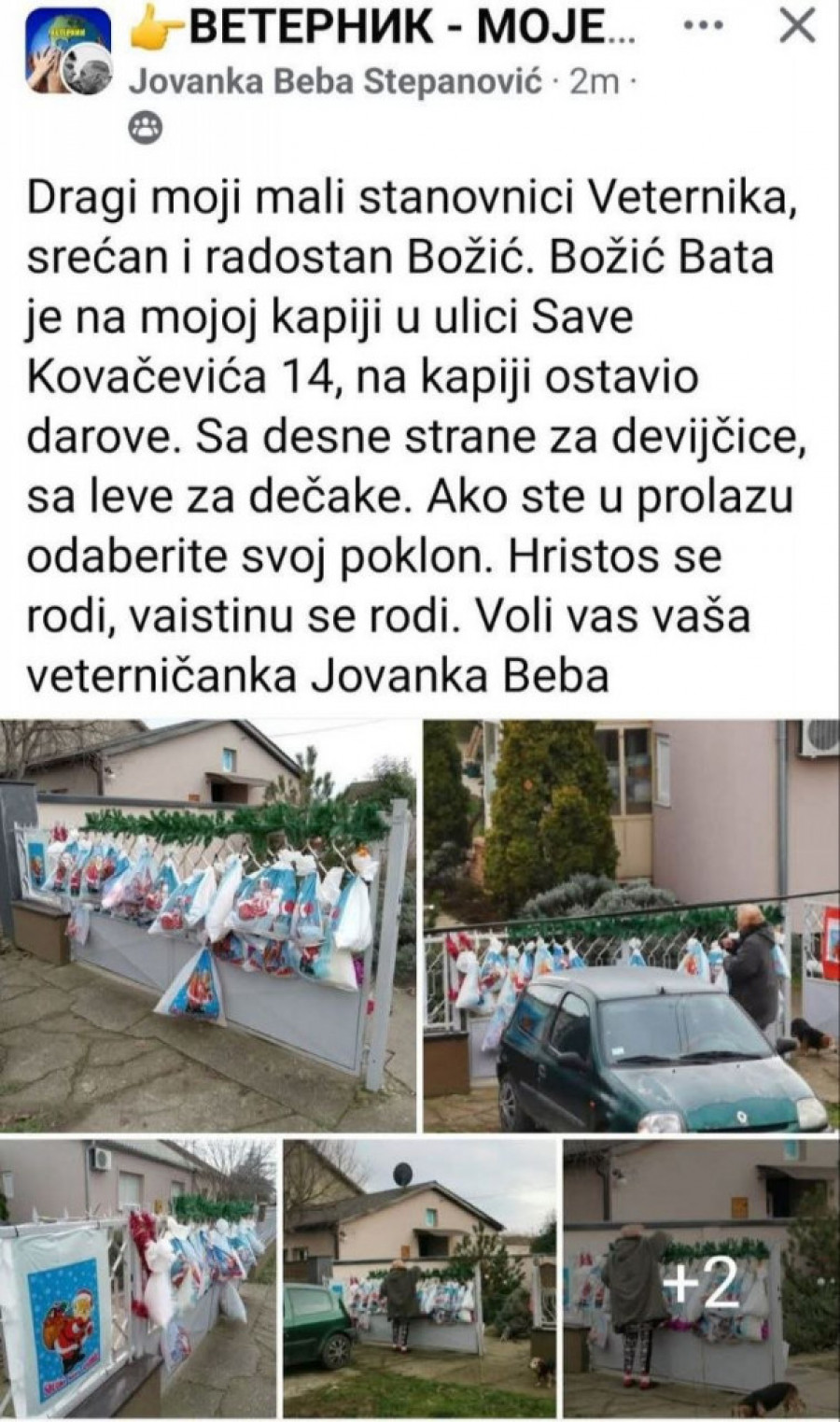 - Dragi moji mali stanovnici Veternika, sretan i radostan Božić - piše na početku objave u Fejsbuk grupi Veternik - moje mesto.