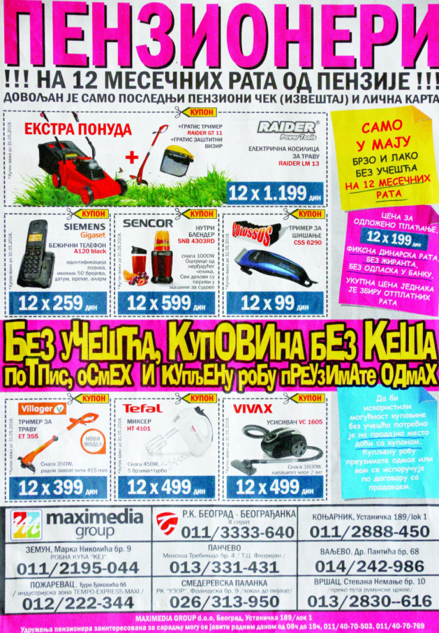 Ovaj trgovinski lanac manipuliše i privlači kupce, mahom najstarije, uz parole "Bez učešća, kupovina bez keša, potpis, osmeh i kupljenu robu preuzimate odmah!" "Iskoristite ponudu koja važi samo do kraja maja", "Dovoljno je da donesete kupon i moći ćete da kupujete na odloženo, samo uz penzijski ček".