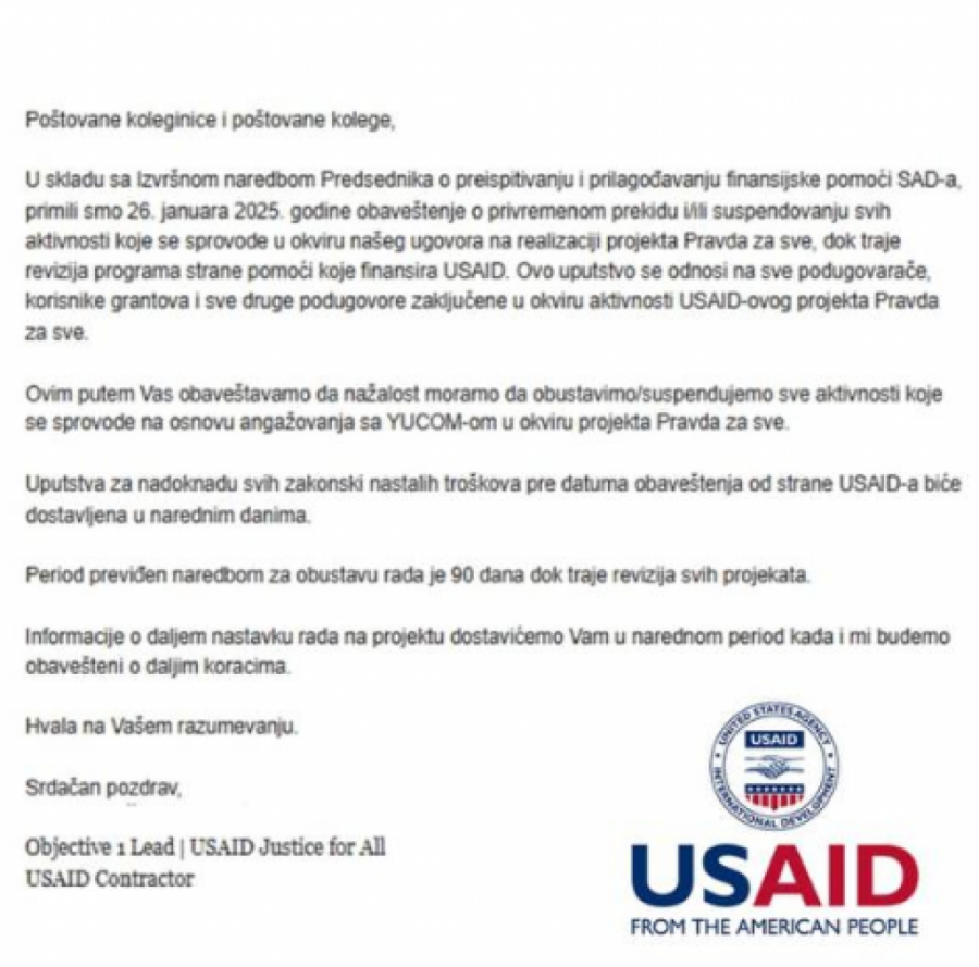Agencija za međunarodni razvoj (USAID) šalje pisma nevladinim organizacijama u Srbiji, u kojima ih obaveštava o privremenom prekidu i/ili suspendovanju svih aktivnosti u skladu sa izvršnom naredbom Donalda Trampa.