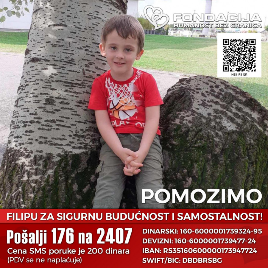 Ovim putem pozivamo sve ljude dobre volje da pomognu Filipu, tako što će preko FONDACIJE – humanost bez granica poslati SMS sa brojem 176 na 2407. Uplate za pomoć u lečenju mogu da se izvrše i na dinarski i devizni račun korisnika i putem E-doniraj internet plaćanjem platnim karticama iz celog sveta, kao i preko platforme PayPal.