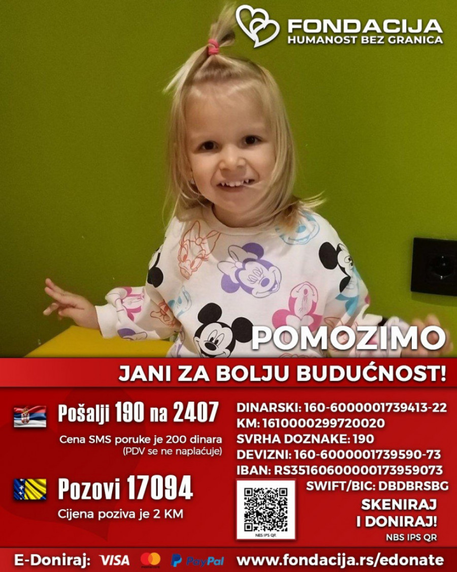 Jana je jako veselo i voljeno dete i do sada su roditelji uspevali da sve troškove snose sami, međutim više nisu u mogućnosti i mole sve ljude dobre volje da pomognu za Janinu bolju budućnost, tako što će preko Fondacije – humanost bez granica, iz Srbije poslati SMS sa brojem 190 na 2407 a iz Bosne i Hercegovine pozvati broj 17094.