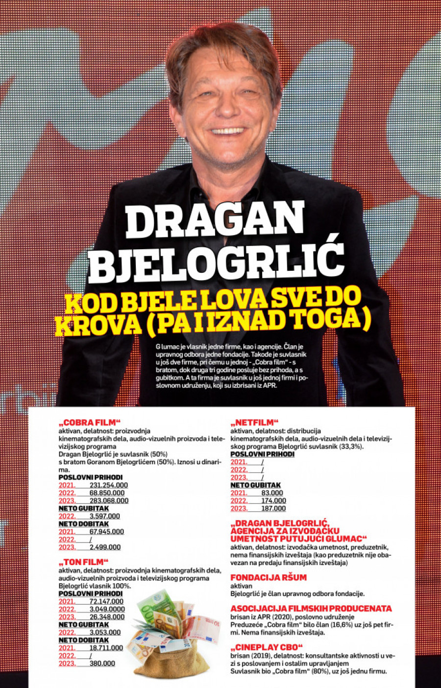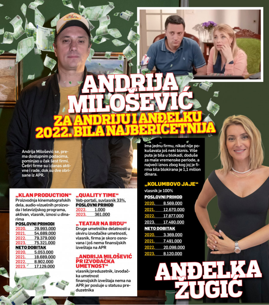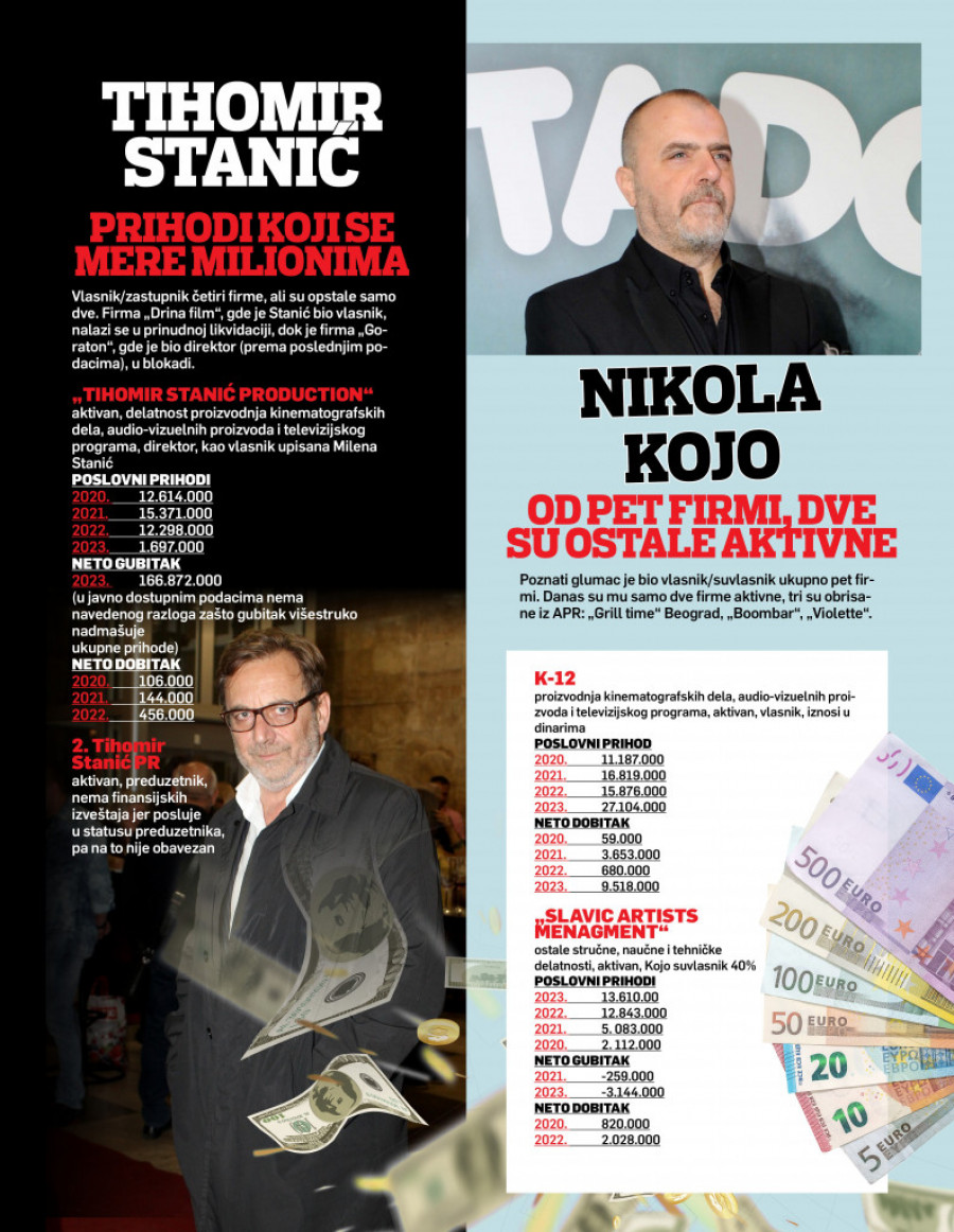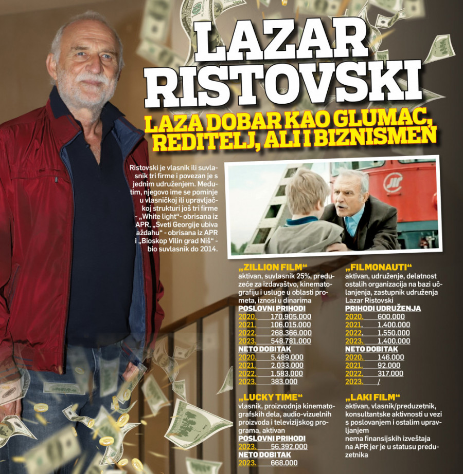 Pojedini srpski glumci i reditelji zarađuju sumu novca koja je iznenadila i najiskusnije poznavaoce industrije, a njihova imena su sada već danima u centru pažnje šire javnosti. Srpski telegraf otkrio je ne samo visoke sume koje dolaze sa njihovih angažmana, već i firmama koje vode, kao i godinama akumulirane prihode i profite koje ostvaruju u svetu sedme umetnosti.