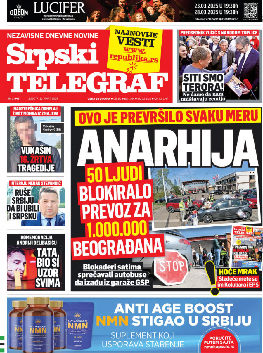 Naslovna strana Srpskog Telegrafa za 22. mart!