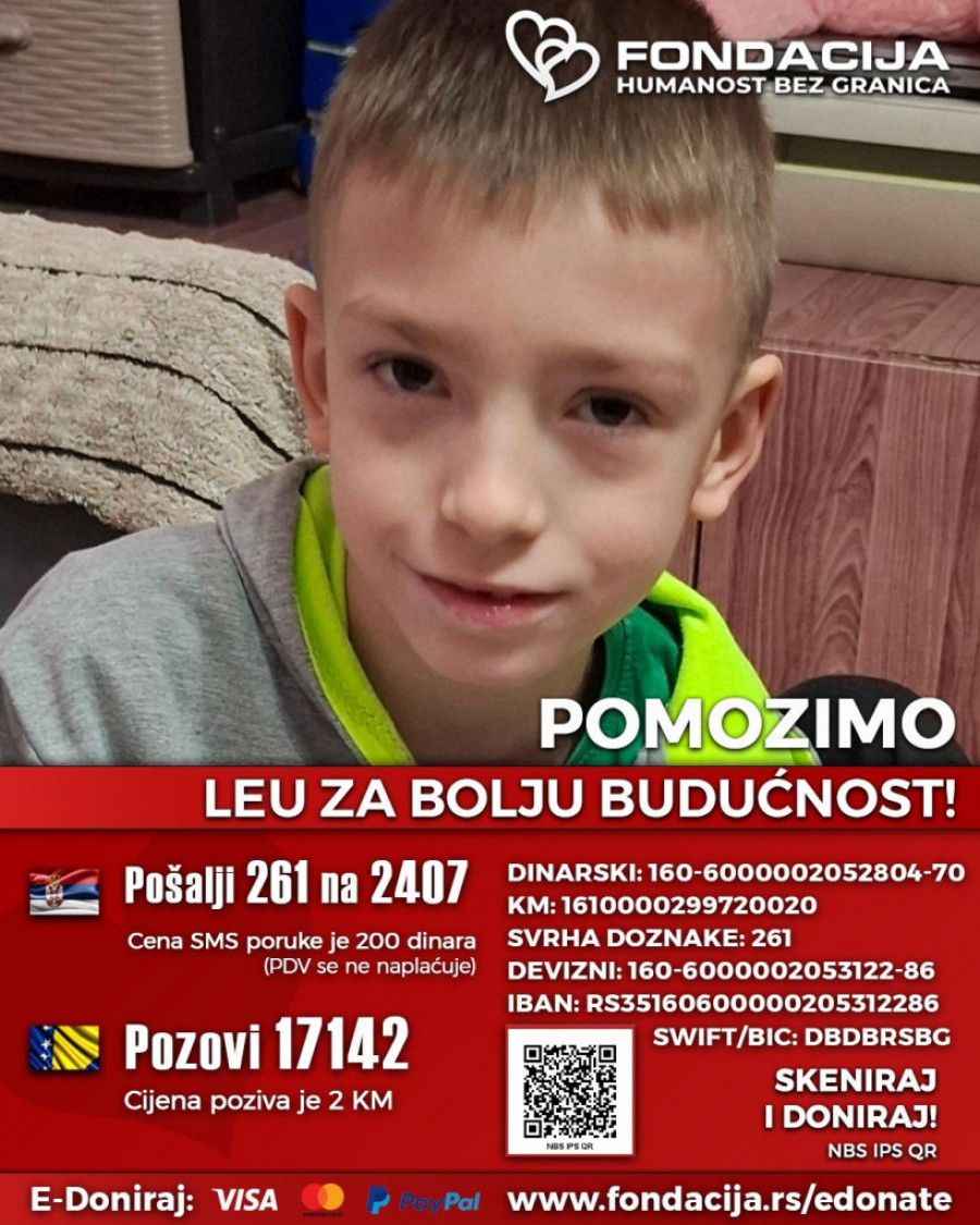 Porodica nije u mogućnosti da finansira lečenje pa ovim putem pozivamo sve ljude dobre volje da pomognu Leu, tako što će preko Fondacije – humanost bez granica, iz Srbije poslati SMS sa brojem 261 na 2407 a iz Bosne i Hercegovine pozvati broj 17142.