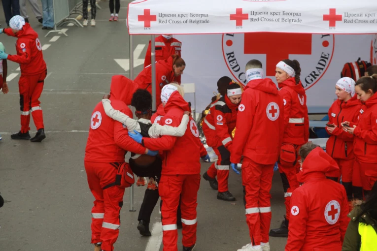 Kako se vidi na snimku sa lica mesta, Hitna pomoć i volonteri Crvenog krsta daju sve od sebe da pomognu čoveku koji nepomično leži.