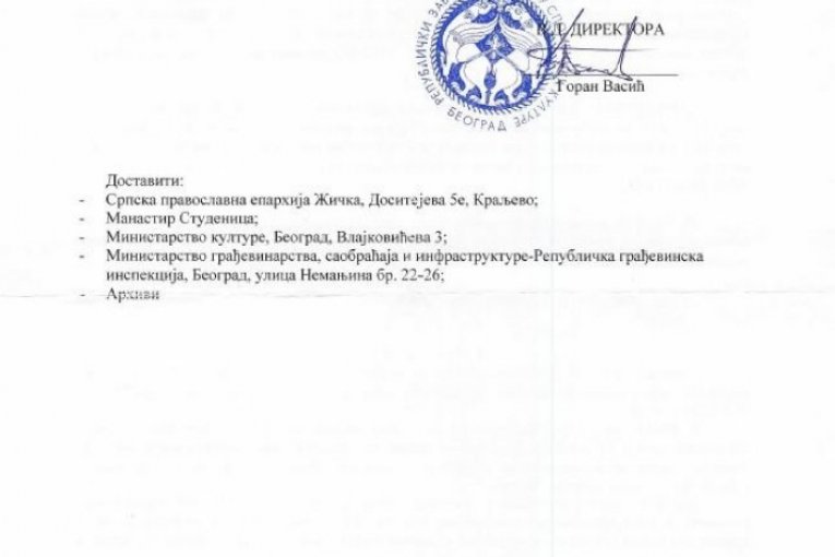 Mitropolit Justin, koji vodi Eparhiju žičku, nelegalno je zidao na dva mesta u okviru manastirskog kompleksa Studenica, koji se nalazi na listi Uneskove svetske kulturne baštine. Zbog toga je morao da reaguje Republički zavod za zaštitu spomenika dopisom da se gradnja hitno zaustavi i sve vrati u prvobitno stanje, pokazuje izveštaj ove institucije od 27. avgusta 2024, do koga je došao naš list!