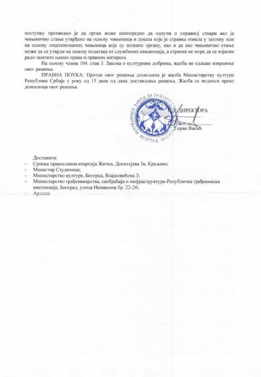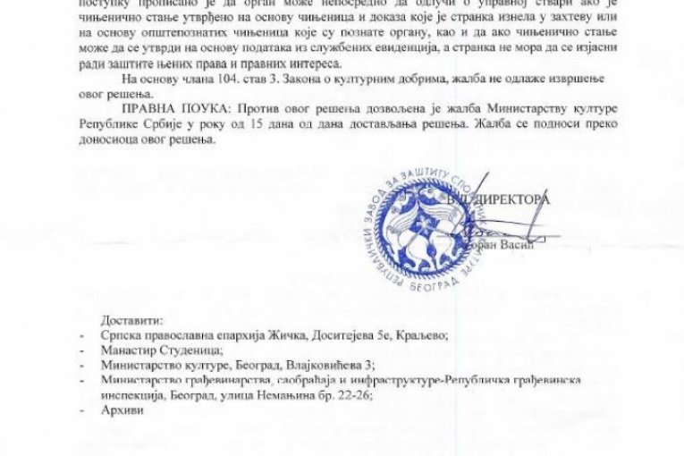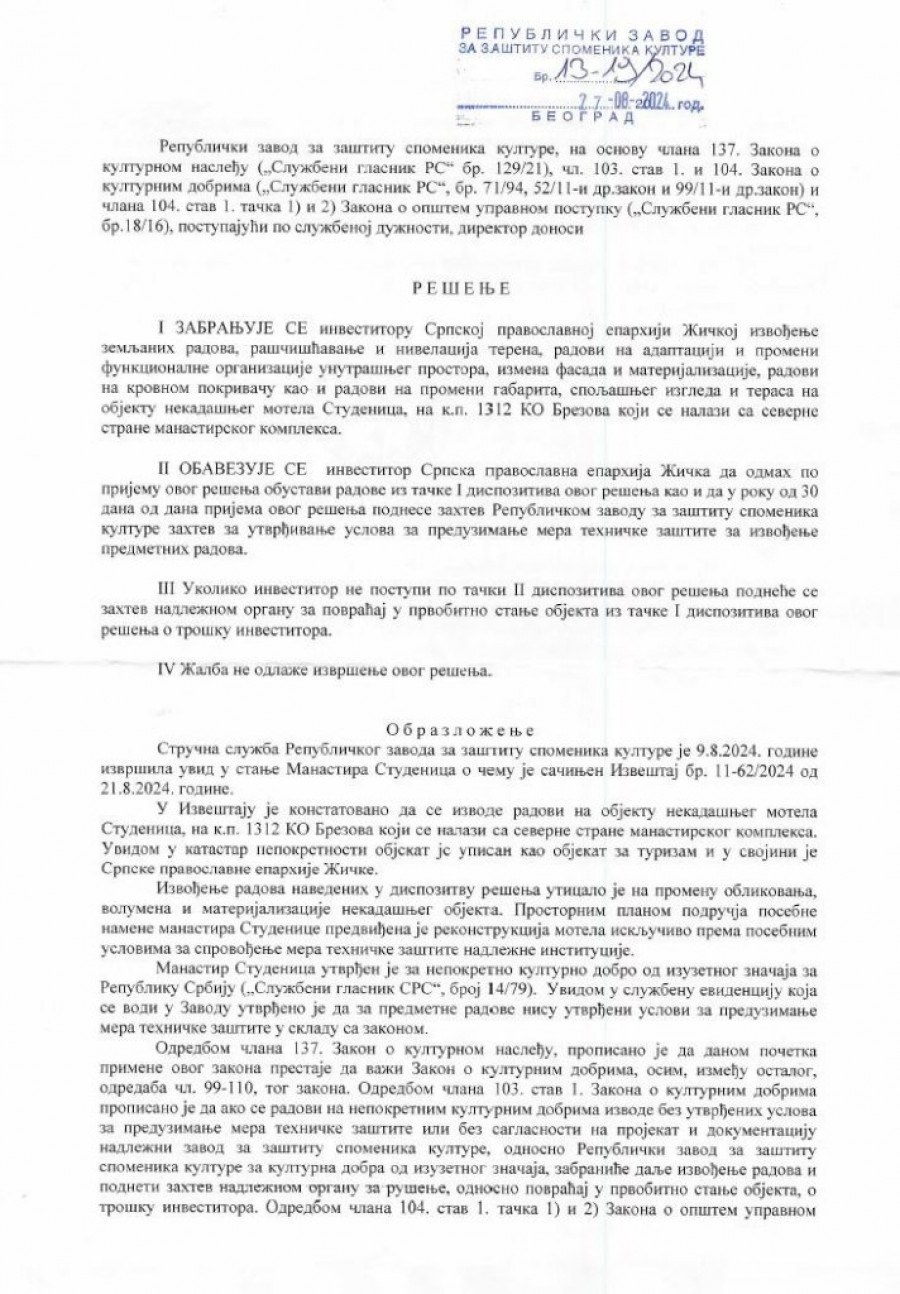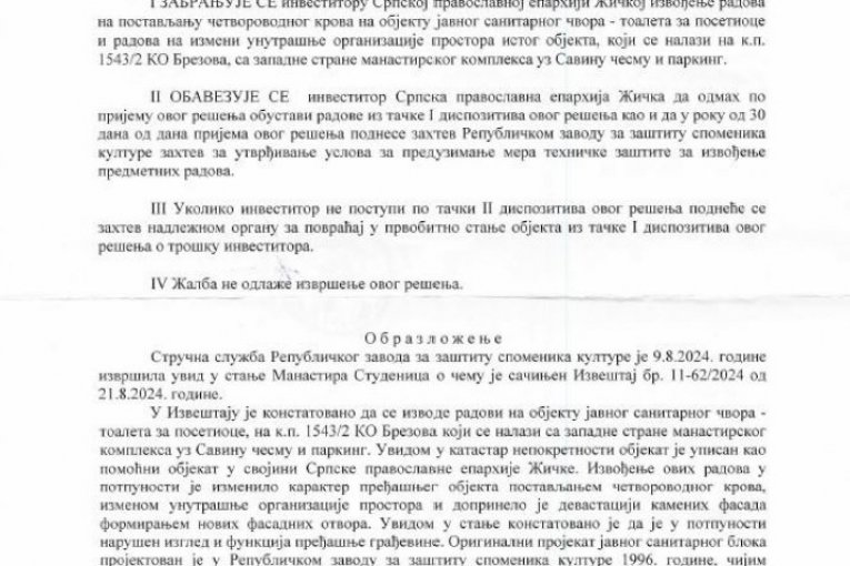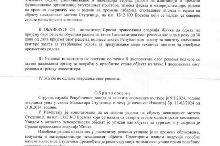 - Zabranjuje se investitoru Eparhiji žičkoj izvođenje zemljanih radova, raščišćavanje i nivelacija terena, radovi na adaptaciji i promeni funkcionalne organizacije unutrašnjeg prostora, izmena fasade i materijalizacije, radovi na krovnom pokrivaču, kao i radovi na promeni gabarita, spoljašnjeg izgleda i terasa na objektu nekadašnjeg motela "Studenica" (danas je to novi konak manastira), na k. p. 1312 KO Brezova, koji se nalaze sa severne strane manastirskog kompleksa - navodi se u rešenju u kojem još stoji: