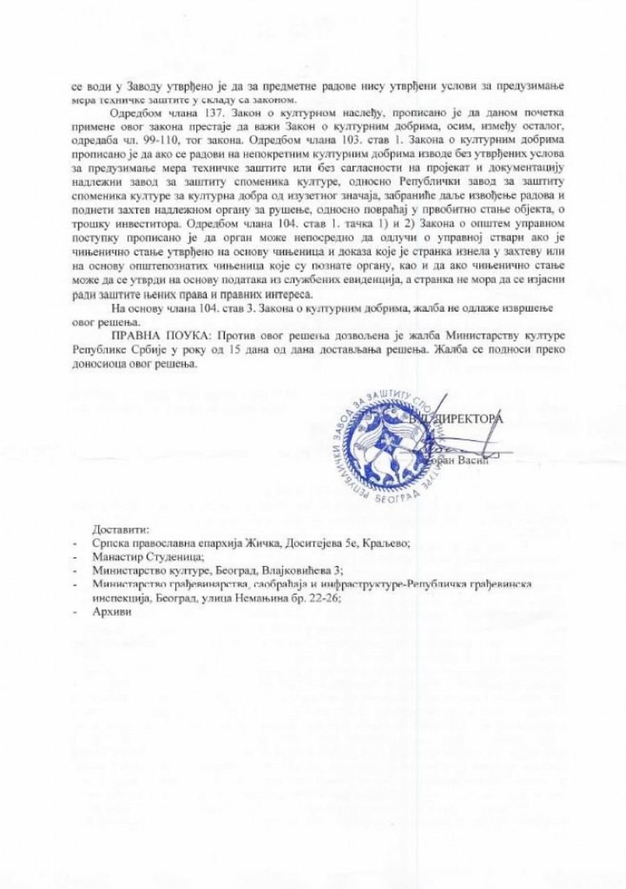 - Obavezuje se investitor da odmah po prijemu ovog rešenja obustavi radove i da u roku od 30 dana od dana prijema ovog rešenja podnese zahtev Republičkom zavodu za zaštitu spomenika kulture za utvrđivanje uslova za preduzimanje mera tehničke zaštite za izvođenje predmetnih radova.