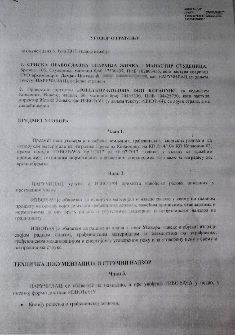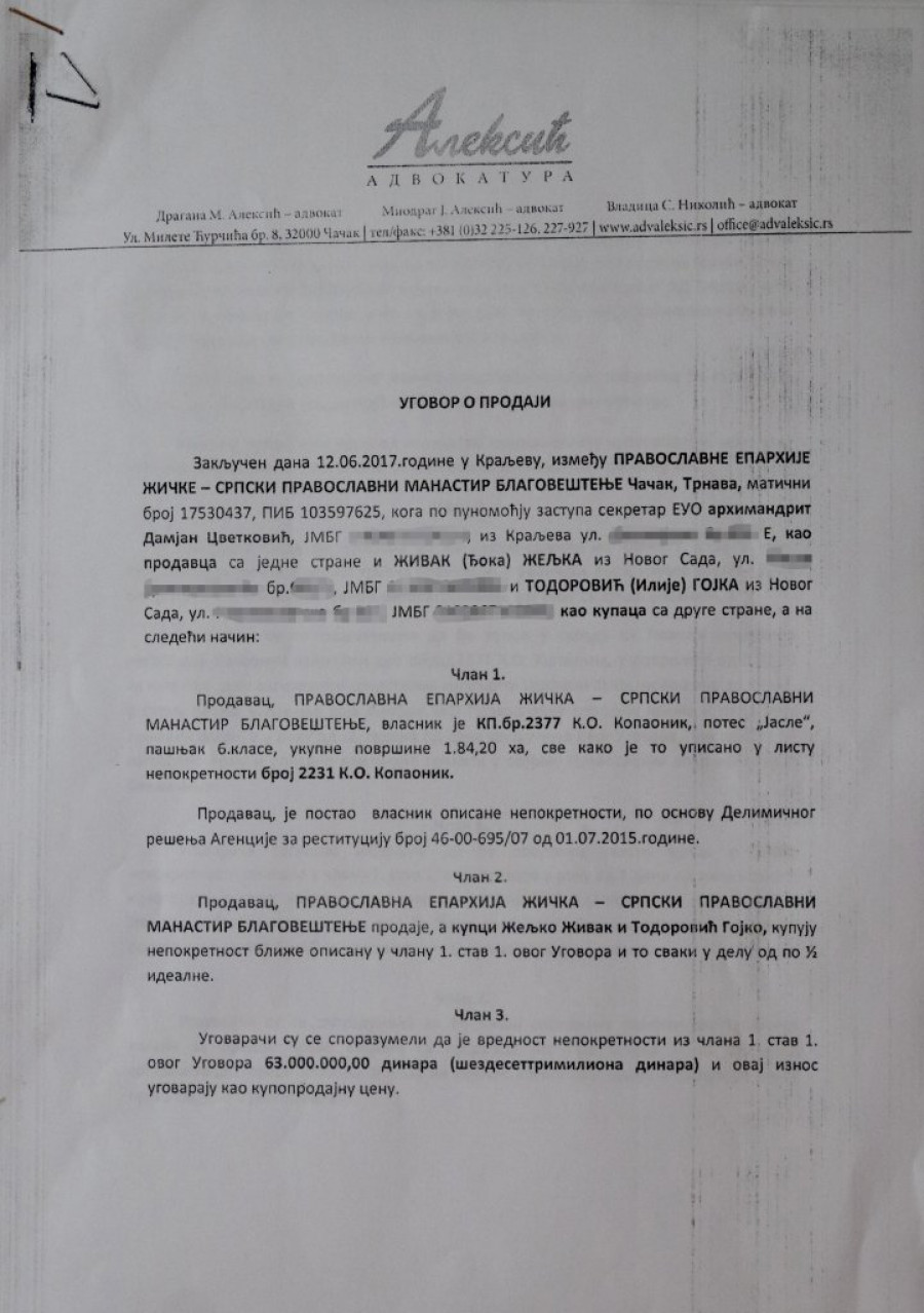 Eparhija je, naime, 2017. zaključila dva sumnjiva ugovora. Jedan o prodaji zemljišta na poznatoj srpskoj planini, a drugi o izgradnji crkve. Srpski telegraf je imao uvid u oba ugovora. Prvim ugovorom, koji je zaključen 12. juna 2017, Eparhija žička - srpski pravoslavni manastir Blagoveštenje Čačak, Trnava, a koga je po punomoćju zastupao sekretar eparhije arhimandrit Damjan Cvetković, prodala je plac na Kopaoniku od 1,84 hektara Željku Živaku i Gojku Todoroviću iz Novog Sada.