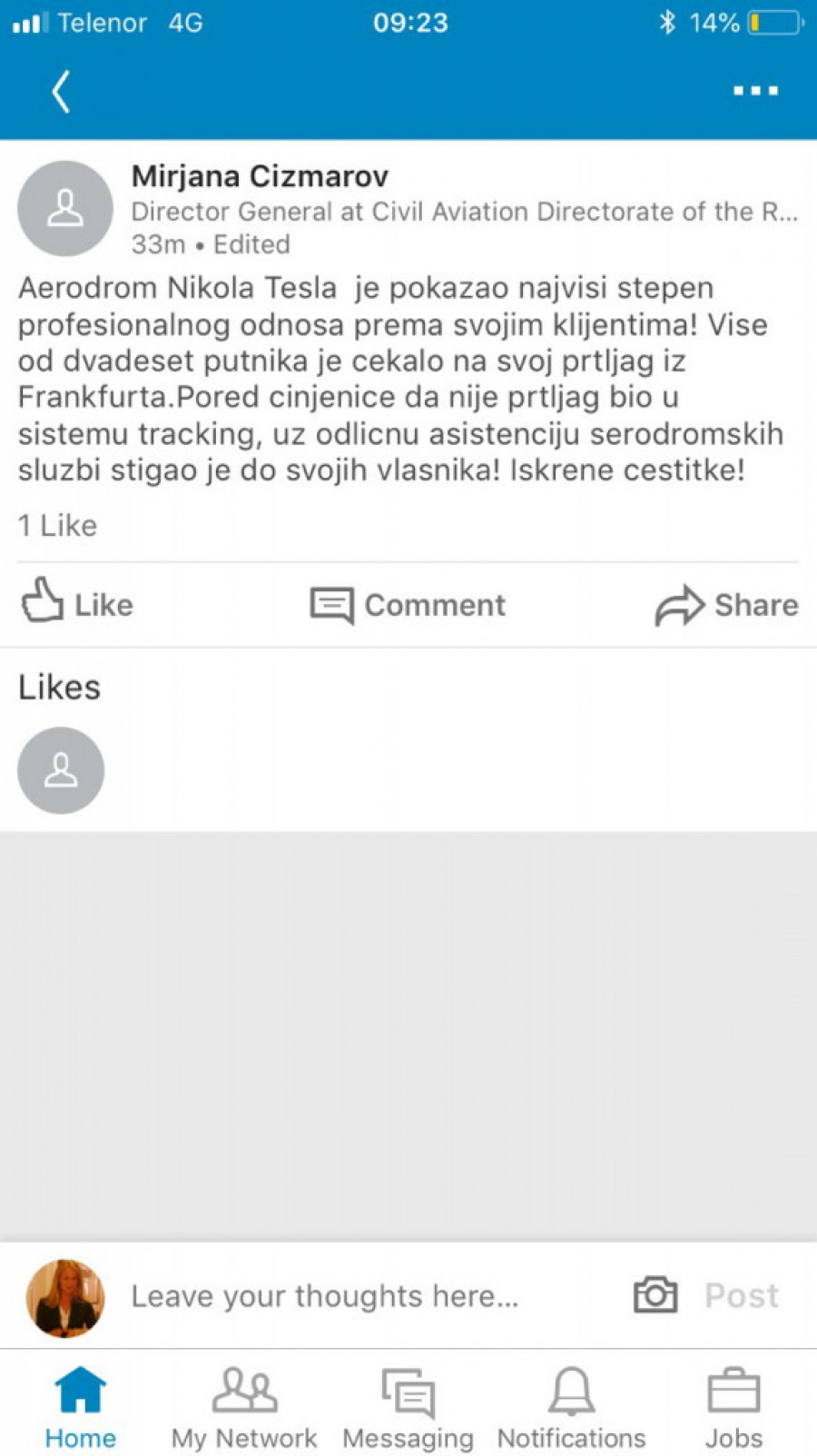 - Aerodrom Nikola Tesla je pokazao najviši stepen profesionalnog odnosa prema svojim klijentima! Više od dvadeset putnika je čekalo na svoj prtljag iz Frankfurta. Pored činjenice da prtljag nije bio sistemu tracking, uz odličnu asistenciju aerodromskih službi stigao je do svojih vlasnika! Iskrene čestitke! - napisala je jedna oduševljena putnica.
