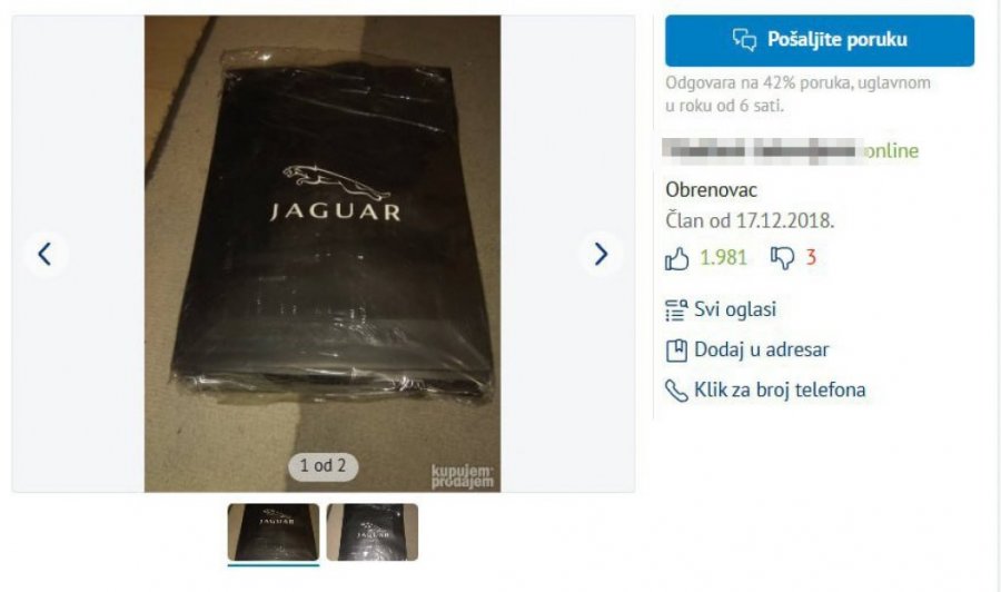 Kod nas ih je, istina, u online prodavnicama nešto manje, ali smo pronašli i oglas postavljen još 2018. godine za prodaju kesa sa logom luksuznih automobila "Jaguar".
