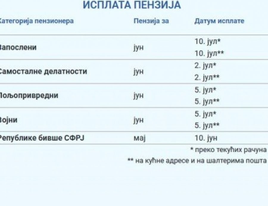 Petog dana u mescu julu penzije će biti isplaćenje penzionerima iz kategorije poljoprivredni i vojni, dok će penzioneri iz kategorije kategorije zaposleni svoje penzije dobiti 10. jula, kada se isplata penzija zvanično i završava.