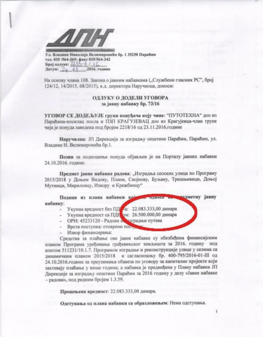 Putotehna DOO zajedno sa PZP Kragujevac koja ima 100 zaposlenih na osnovu reči direktora JP Direkcije za izgradnju Paraćina Aleksandra Milojkovića inače bila je jedini ponuđač na pomenutom konkursu za izgradnju seoskih ulica.
