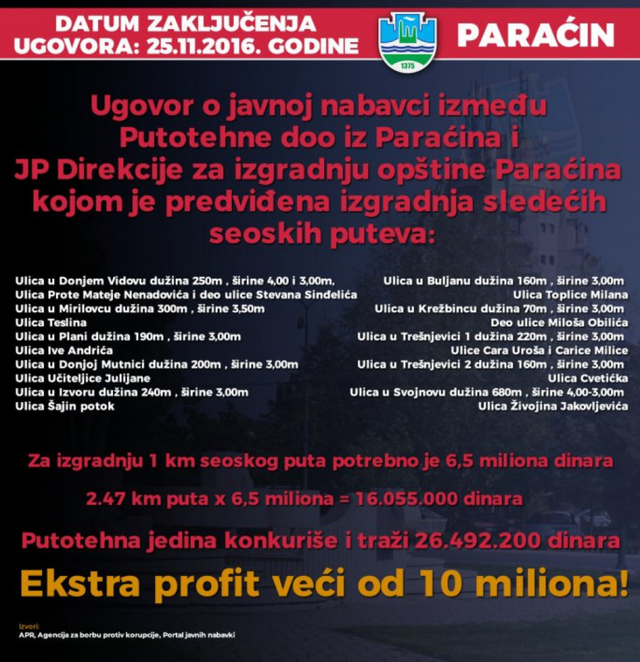 S obzirom na to da asfaltiranje jednog kilometra seoskog puta, prema zvaničnim procenama Građevinskog fakulteta, košta oko šest i po miliona dinara, nameće se zaključak da je Putotehna zahvaljujući unosnom ugovoru sa Direkcijom za izgradnju samo na tom poslu ostvarila ekstra profit veći od 10 miliona dinara, piše srbijadanas.com!
