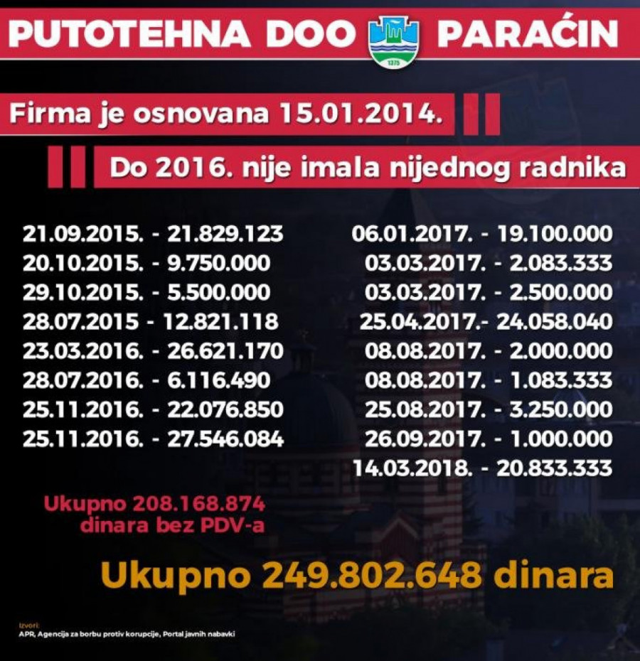 Foto: Privatna arhiva/srbijadanas.comInače, prema podacima iz APR Putotehna doo iz Paraćina je u periodu od 2014.-2017. godine prihodovala 237.260.000 dinara. Kako smo saznali firma Putotehna tokom 2014. i 2015. nije imala zaposlene radnike, a tek krajem 2016. je zaposlila prve radike.