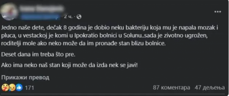 - Jedno naše dete, dečak 8 godina je dobio neku bakteriju koja mu je napala mozak i pluća, u veštačkoj je komi u Ipokratio bolnici u Solunu.. sada je životno ugrožen, roditelji mole ako neko može da im pronađe stan blizu bolnice. Deset dana im treba što pre. Ako ima neko naš stan koji može da izda nek se javi! - glasi objava.