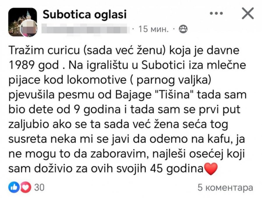 PEĐA IZ SUBOTICE TRAŽI SVOJU PRVU LJUBAV! Objava na društvenim mrežama rastopila i najtvrđa srca: Pevušila je "Tišinu" od Bajage, TAKAV OSEĆAJ ZA 45 GODINA NISAM DOŽIVEO! (FOTO)