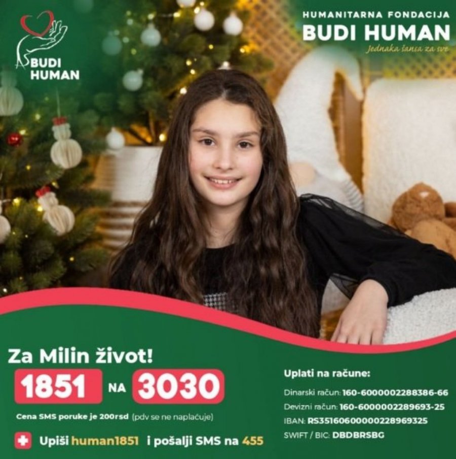 Za nastavak Milinog lečenja u inostranstvu potrebna su značajna finansijska sredstva koja njena porodica ne može sama da obezbedi. Zbog toga je neophodna pomoć svih ljudi dobre volje u vidu donacija.
