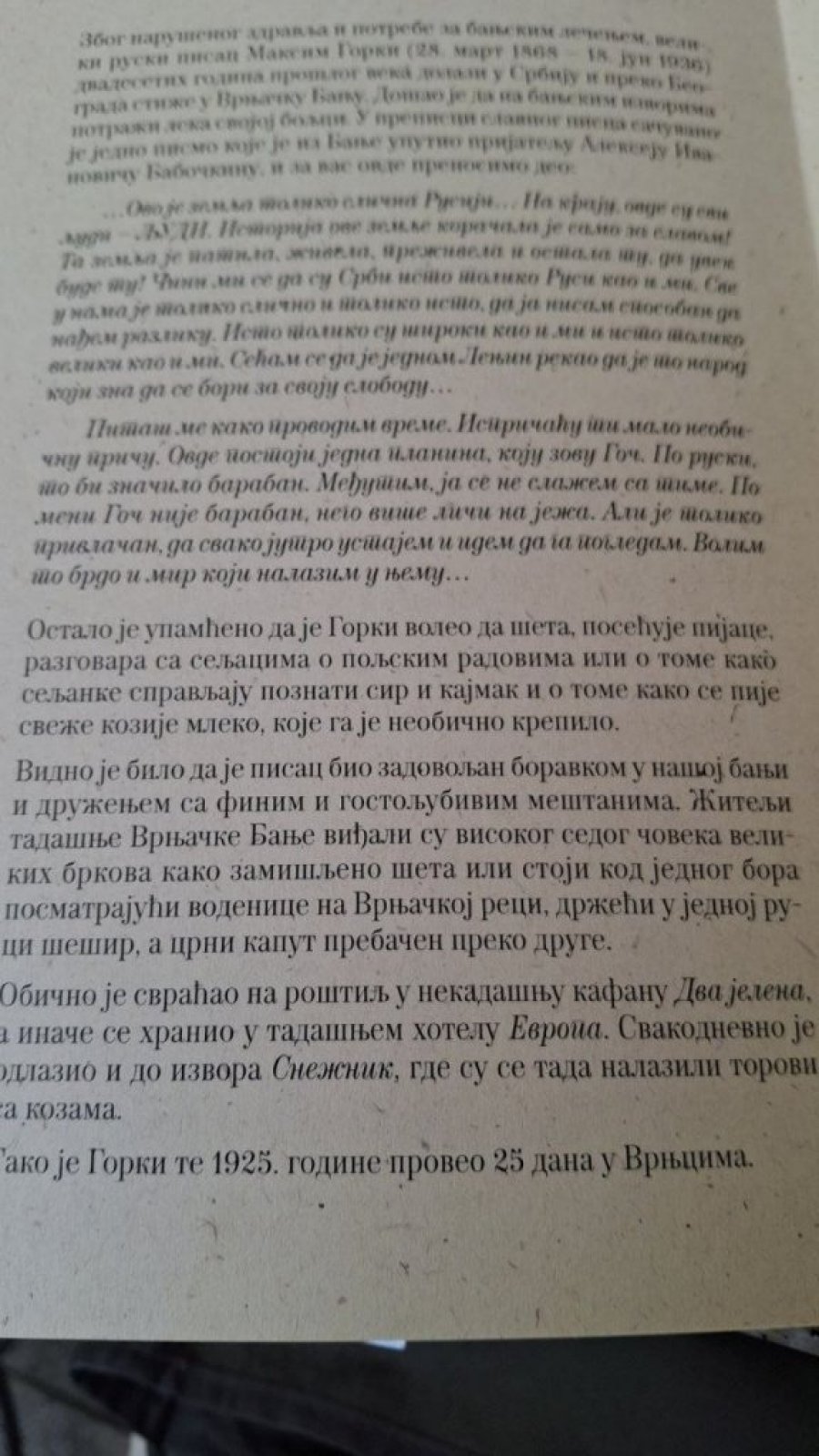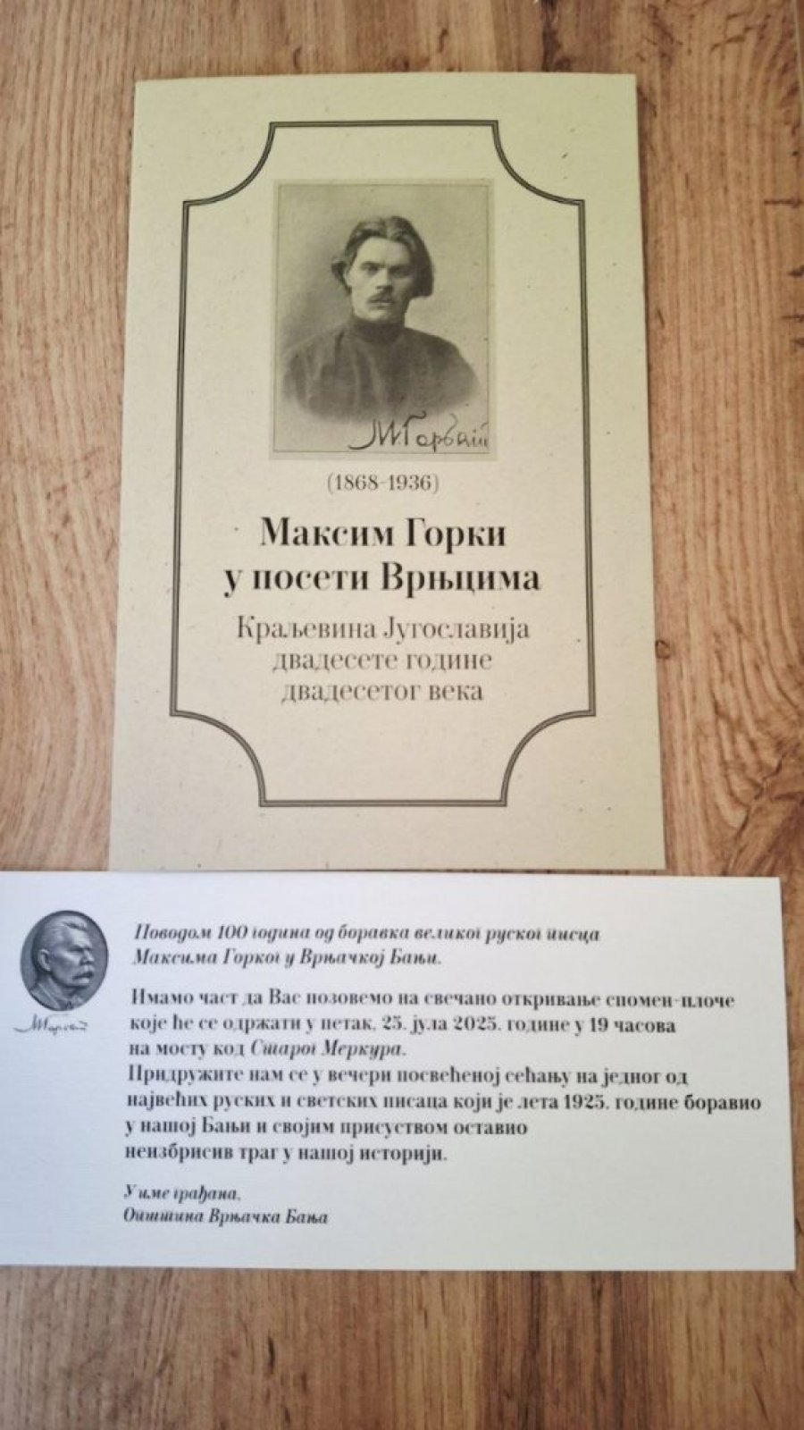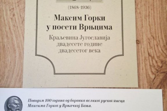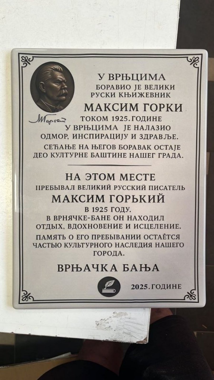 Vrnjačka Banja, biser srpskog turizma i mesto bogate istorije, večeras u 19 časova će svečano otkriti spomen ploču čuvenom ruskom piscu Maksimu Gorkom, koji je pre tačno jednog veka ovde proveo posebne dane svog života.