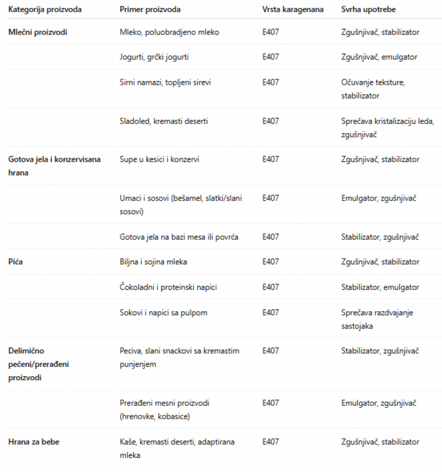 - Prirodnog je porekla i dobija se iz crvenih morskih algi. U prehrambenoj industriji koristi se već više od 50 godina, najčešće kao zgušnjivač, stabilizator i emulgator u mlečnim proizvodima, biljnim napicima, jelima u prahu i gotovim umacima. Regulatorna tela širom sveta tretiraju ga kao siguran dodatak ishrani - naveli su u odgovoru za naš portal.