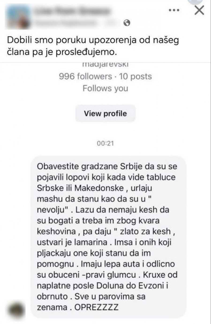 - Obavestite građane Srbije da su se pojavili lopovi koji kada vide srpske ili makedonske tablice urlaju, mašu da stanukao da su u nevolji. Lažu da nemaju keš, da su bogati, a treba im keš zbog kvara, pa daju zlato za keš. Ima i onih koji pljačkaju one koji stanu da im pomognu - upozoravali su ranije.