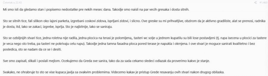 - Ljudi, ovo je katastrofa! Ovako loš kvalitet radova je sramotan. Uopšte nije bitno da li stan treba da pregleda kupac ili "kontrolor", ovo jednostavno nije smelo da se dogodi. Rupe kod utičnica? Opušci na podu? Zidovi iskrzani... Renovirao sam svoj stari stan i znam kako neke stvari funkcionišu. Čovek mi je dolazio četiri puta da uradi parket i lajsne: prvi put da lepi, drugi put da farba, treći put da farba ponovo, a četvrti put, kada su stigli ormari, da stavi ispod, pa opet posle da farba. I onda vidim da je neko stavio lajsnu iz ugla na vrata s onolikom rupom. Boga pitaj kako su urađene sve bitne stvari: struja, voda, grejanje, pod i stolarija. Sramota - samo je jedan od komentara revoltiranih kupaca.