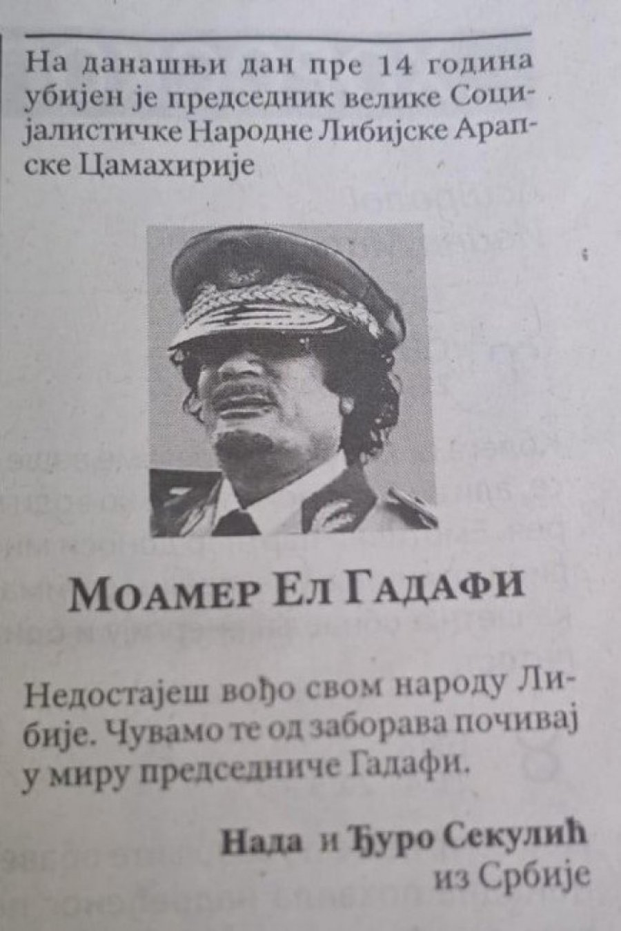 - Nedostaješ, vođo, svom narodu Libije. Čuvamo te od zaborava! Počivaj u miru, predsedniče Gadafi - piše u čitulji.