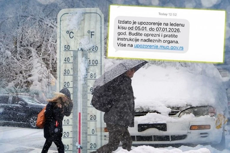 Ministarstvo unutrašnjih poslova (MUP) izdalo je alarm za vanredni događaj zbog ledene kiše koja je zahvatila više područja Republike Srbije. Na mobilne telefone građana u ugroženim regionima stigao je i hitan SMS, kojim se upozorava na izuzetno nepovoljne vremenske uslove i visok rizik po bezbednost.