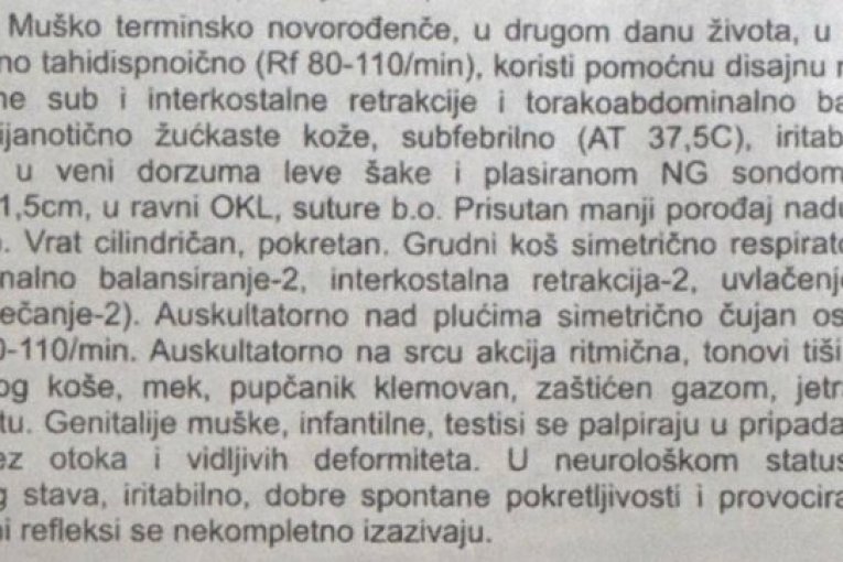 - Beba se rađa s ocenom deset, ali nakon toga počinje pakao. Čujem da sin neobično plače. Odmah sam pitala šta se dešava, dok sam bila na stolu. Doktorka prilazi i izgovara, verovali ili ne, doslovno ove reči: "Plače tim intenzitetom zato što je derište i divljak!" Bila sam rasporena posle carskog reza i nisam mogla ništa da joj odgovorim. Dete mi ne donose, iako sam prebačena u sobu. Neonatolog dolazi nakon sat vremena i govori da su detetu nezrela pluća, da su bili prinuđeni da ga stave u inkubator. Pokušali su da me umire, osetila sam da to nije istina.