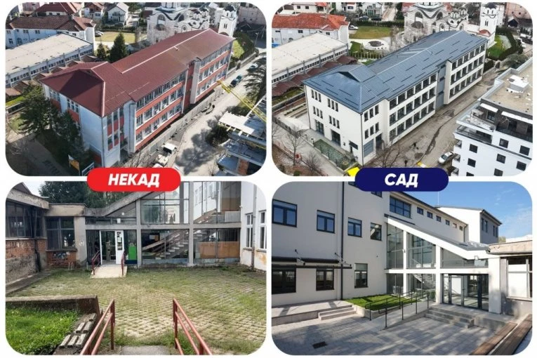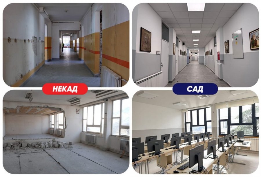 Inače, na fotografijama se vidi da je škola posle rekonstrukcije savremeno opremljena, s kabinetima s računarima, a da su pre rekonstrukcije na objektu otpadali delovi fasade, da su bila razbijena vrata na toaletima.