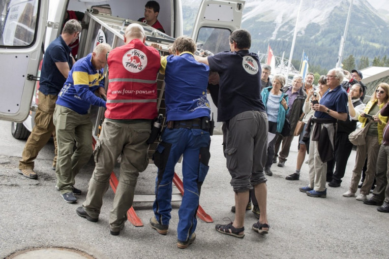 Nakon 28 sati vožnje, po prispeću u Arosu, kavez sa medvedom je morao biti transportovan skijaškom gondolom do samog prihvatilišta, obzirom da je njihova ukupna težina bila preko pola tone. Hibrid mrkog i polarnog medveda iz Srbije je prvi stanovnik novog prihvatilišta u Arosi, čije je zvanično otvaranje planirano u avgustu ove godine.