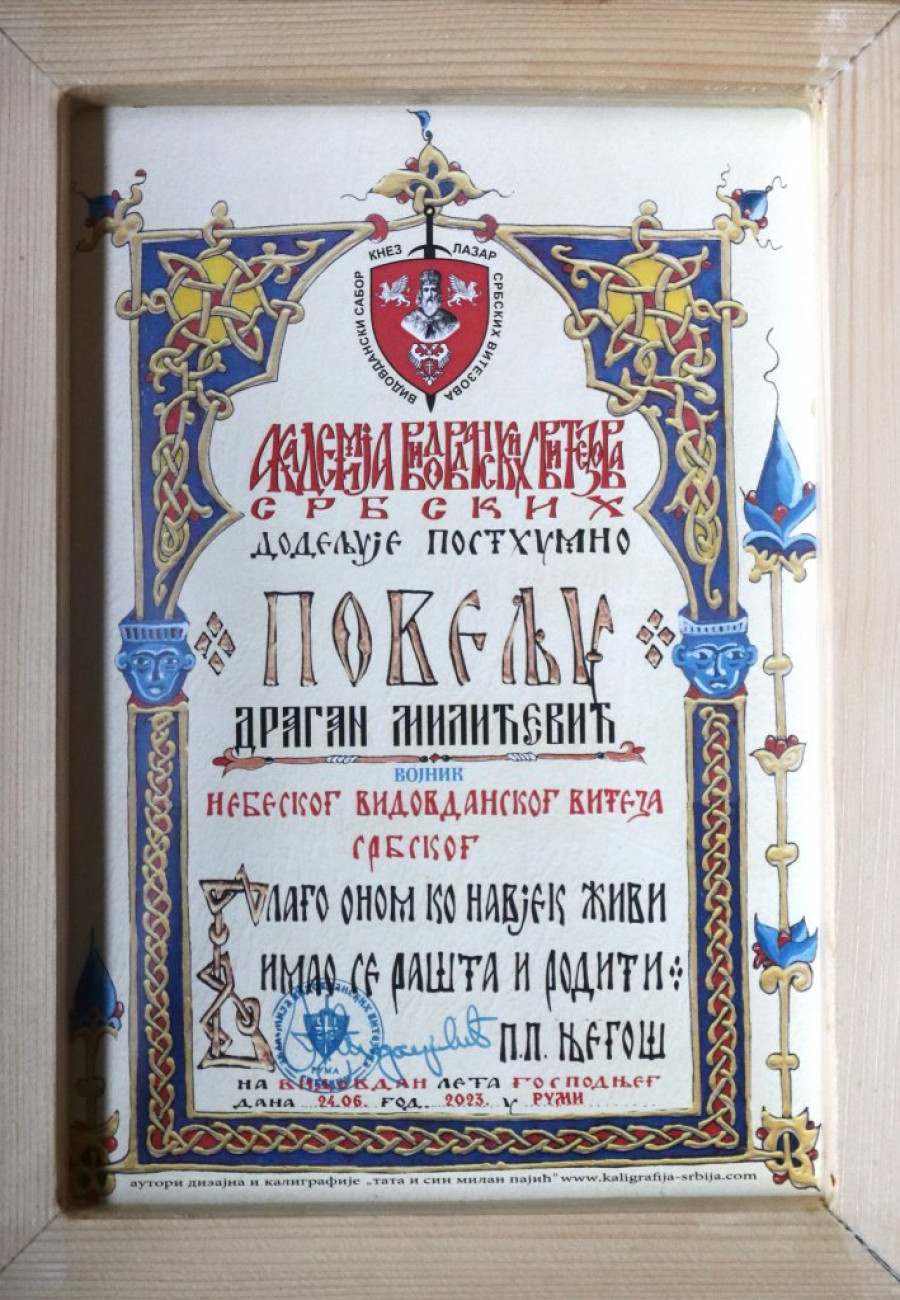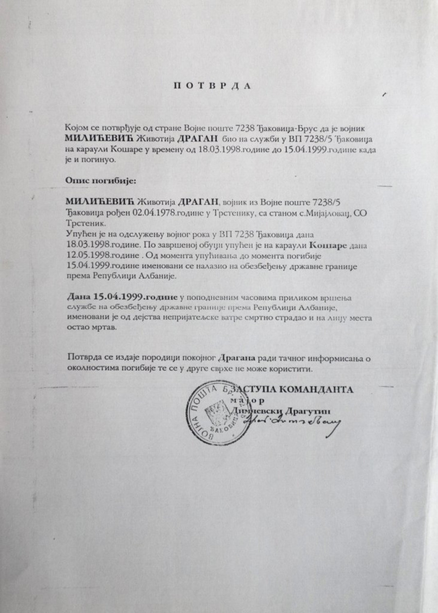 - Služili su svojoj zemlji i ostavili nam u amanet da i je i mi čuvamo. Dobio je poziv za armiju, martovska klasa. Na pozivu je pisalo "otadžbina te zove". Na karauli Košare proveo je 11 meseci. Očekivali smo da dođe kući, brojali dane, sate. Nismo dočekali. Neki su preživeli, neki bili izranjavani, a njih 108, među kojima je i moj Dragan, položili su živote na oltar otadžbine.