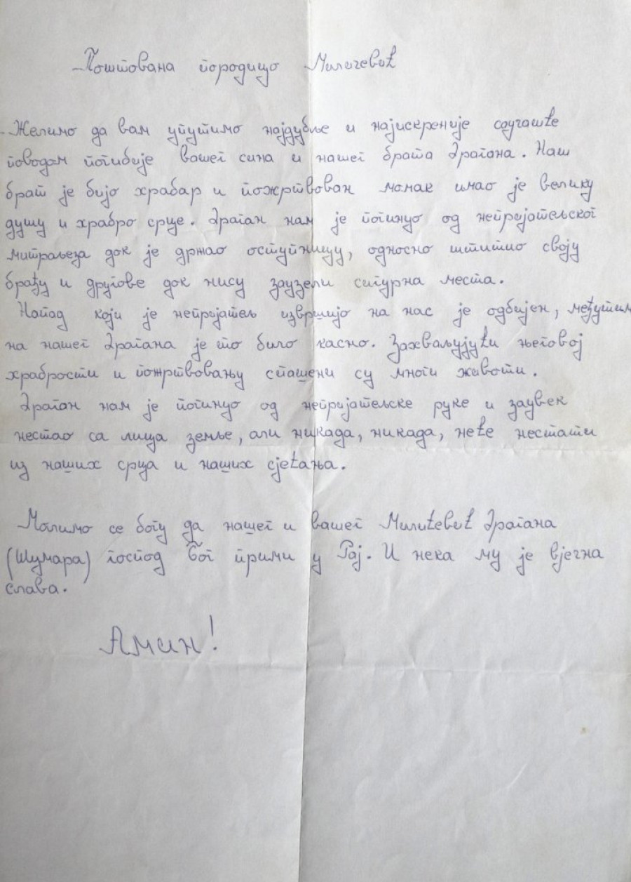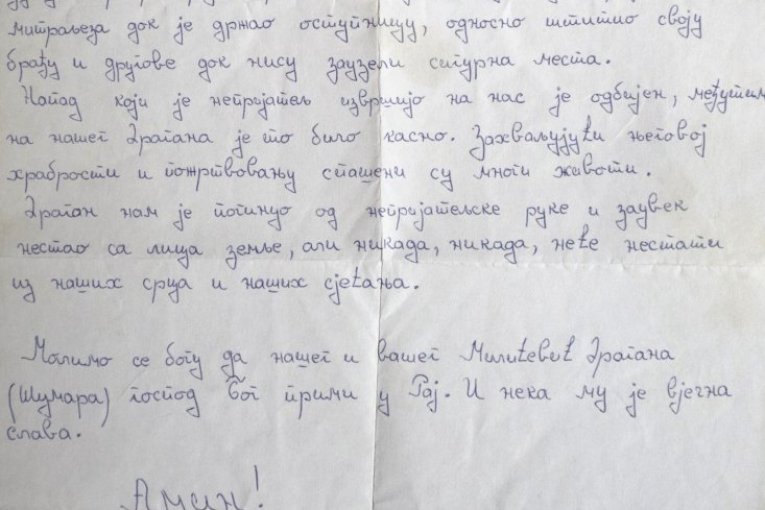 - Nisam stigao da vidim da je porastao. Došao je na odsustvo posle devet meseci na karauli. Tog dana padao je sneg i namerno sam ga zamolio da odemo do obližnjeg brda da kao posečemo neka drva, a zapravo da pričamo. Ispred mene je bio ozbiljan, zreo čovek i video sam da ne postoji mogućnost da se on odvrati da ne ode nazad i ne bude s drugovima. Morao sam tad kao roditelj da mu kažem da poslednji metak ostavi za sebe. I jeste. U jednom dokumentu, koji smo dobili, piše da je imao kod sebe novčanice, cigarete i na kraju spiska stoji jedan metak 7,9 mm, to je iz puškomitraljeza. Dakle, ostavio je jedan metak za sebe. Poslušao me je. I rekao sam mu: "Nemoj da dozvoliš da ti vade oči, seku uši, da te masakriraju, ubij se kao čovek i doći ćeš kući kao čovek u kovčegu." I tako je i bilo. Kao da sam znao. Naslutio sam. Te reči me prate... (plač). Kao roditelj možda nisam imao na to pravo, ali sam imao potrebu, znajući da ide u rat.