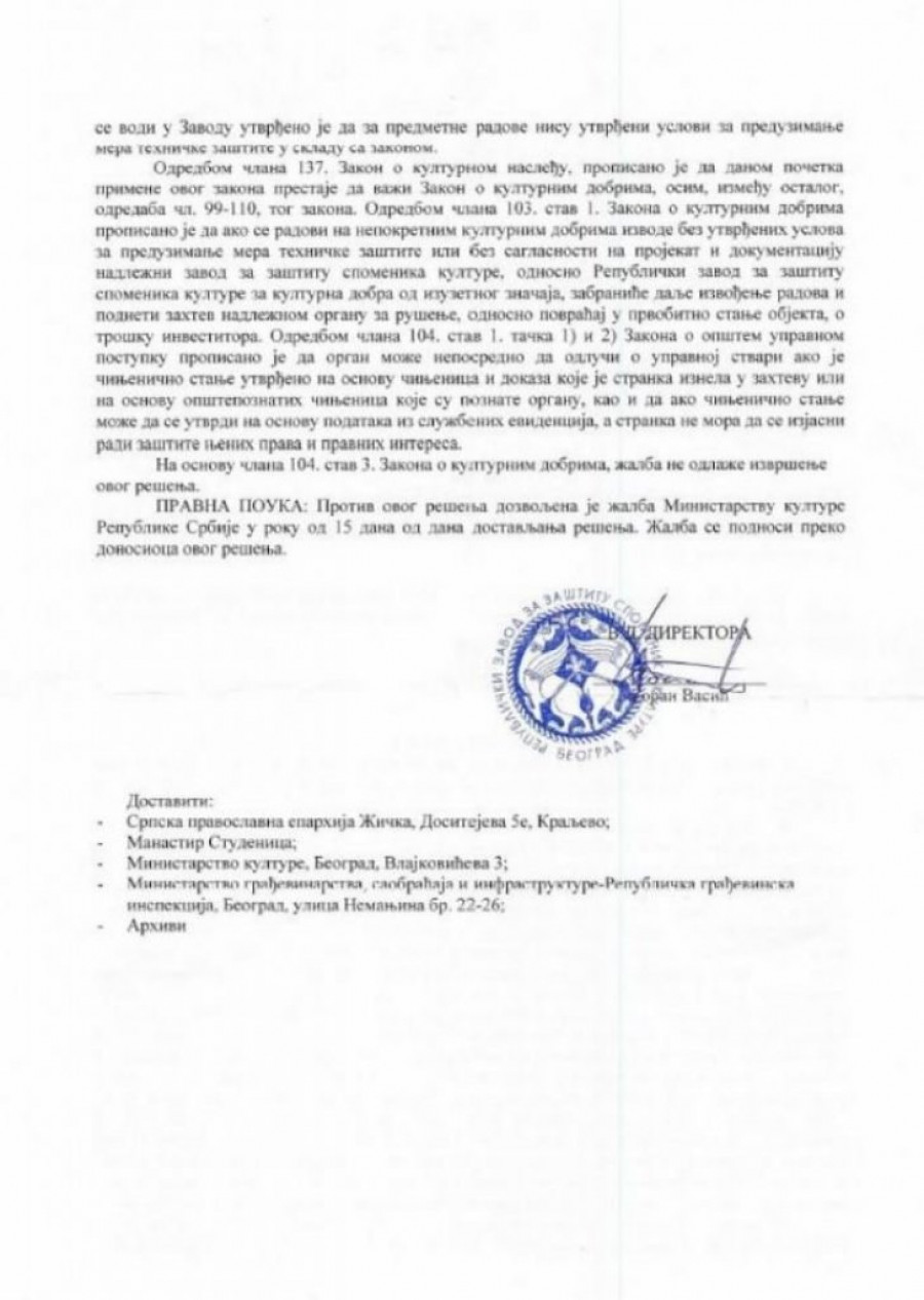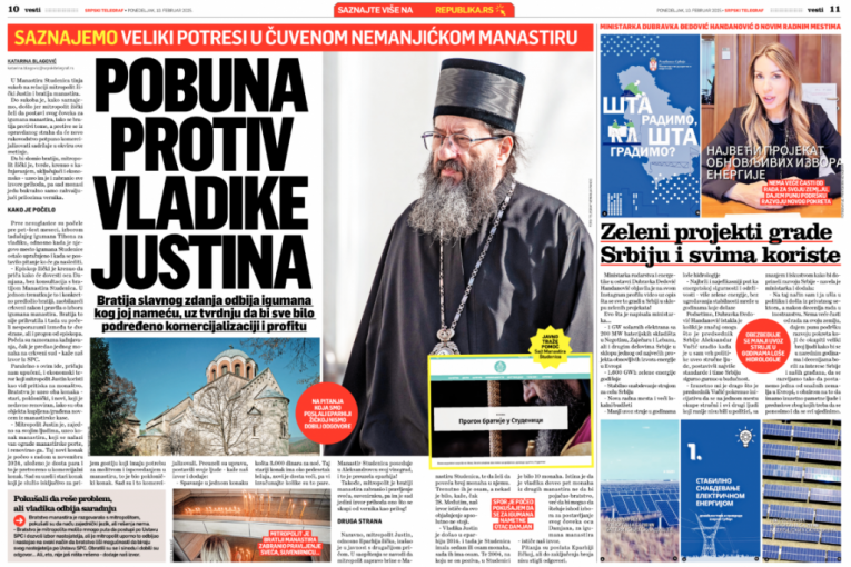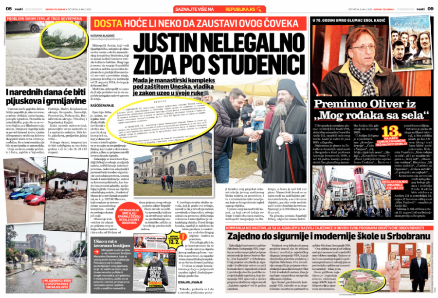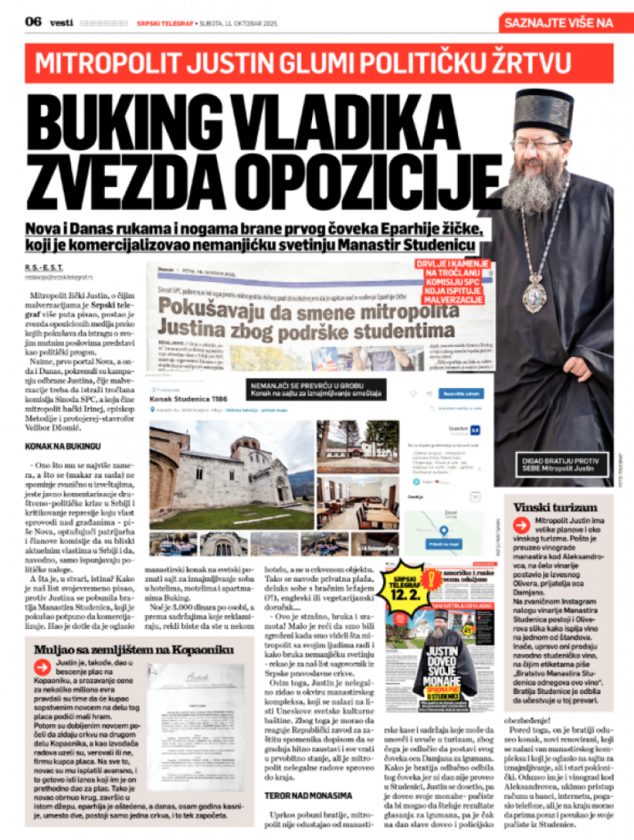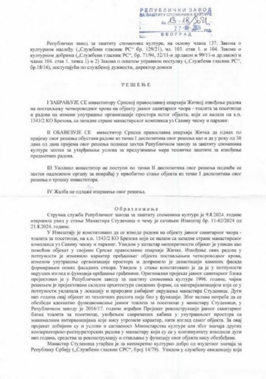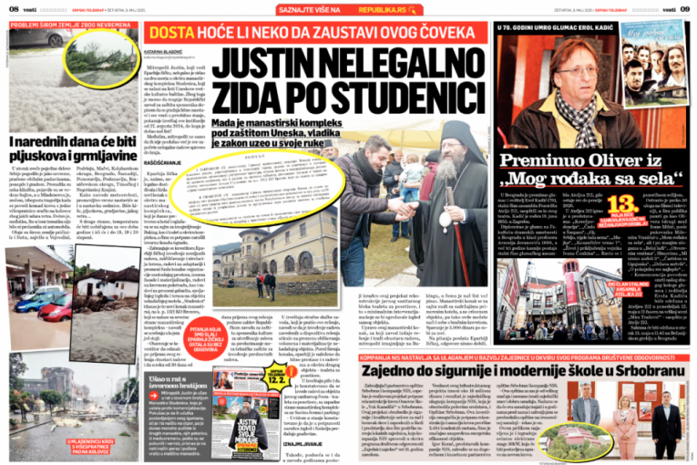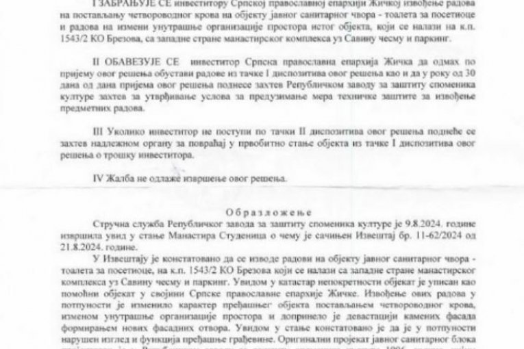 Mitropolit Justin nelegalno je zidao na dva mesta u okviru manastirskog kompleksa Studenica, koji se nalazi na listi Uneskove svetske kulturne baštine. Zbog toga je morao da reaguje Republički zavod za zaštitu spomenika dopisom da se gradnja hitno zaustavi i sve vrati u prvobitno stanje, pokazuje izveštaj ove institucije od 27. avgusta 2024, do koga je došao naš list!