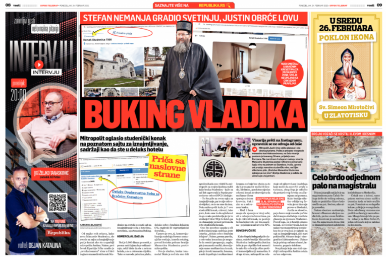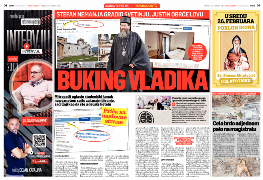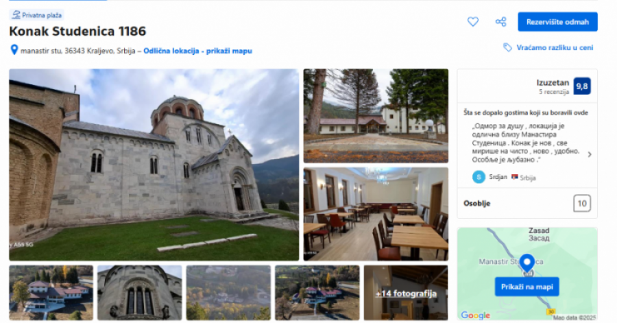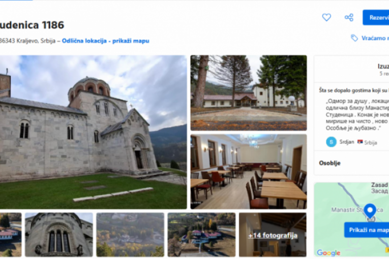 Od majke svih crkava, kako zovu Manastir Studenica, do zvezde na sajtu za iznajmljivanje put je kratak ako ste bili u eparhiji mitropolita Justina. Naime, prvi čovek Eparhije žičke uradio je "revolucionarnu" stvar u Crkvi i oglasio manastirski konak Studenice na svetski poznati sajt za iznajmljivanje soba u hotelima, motelima, apartmanima Buking.