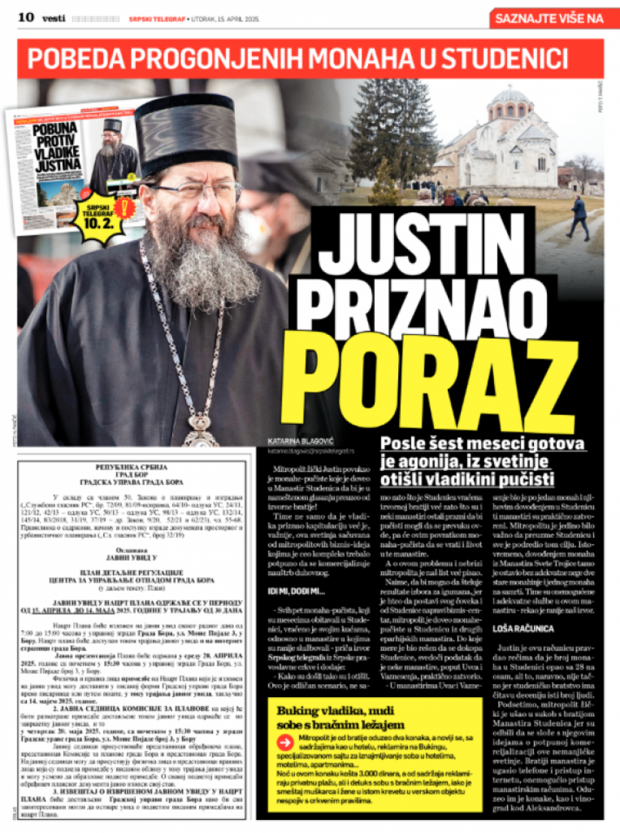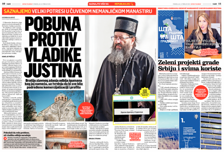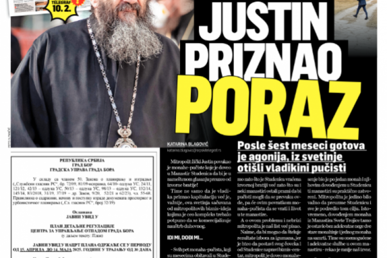 Informacija koja je stigla u sredu posle podne da je Sveti arhijerejski sinod Srpske pravoslavne crkve smenio vladiku žičkog Justina i pokrenuo postupak za utvrđivanje njegove kanonske odgovornosti označila je još jednu veliku pobedu Srpskog telegrafa i našeg portala Republika.
