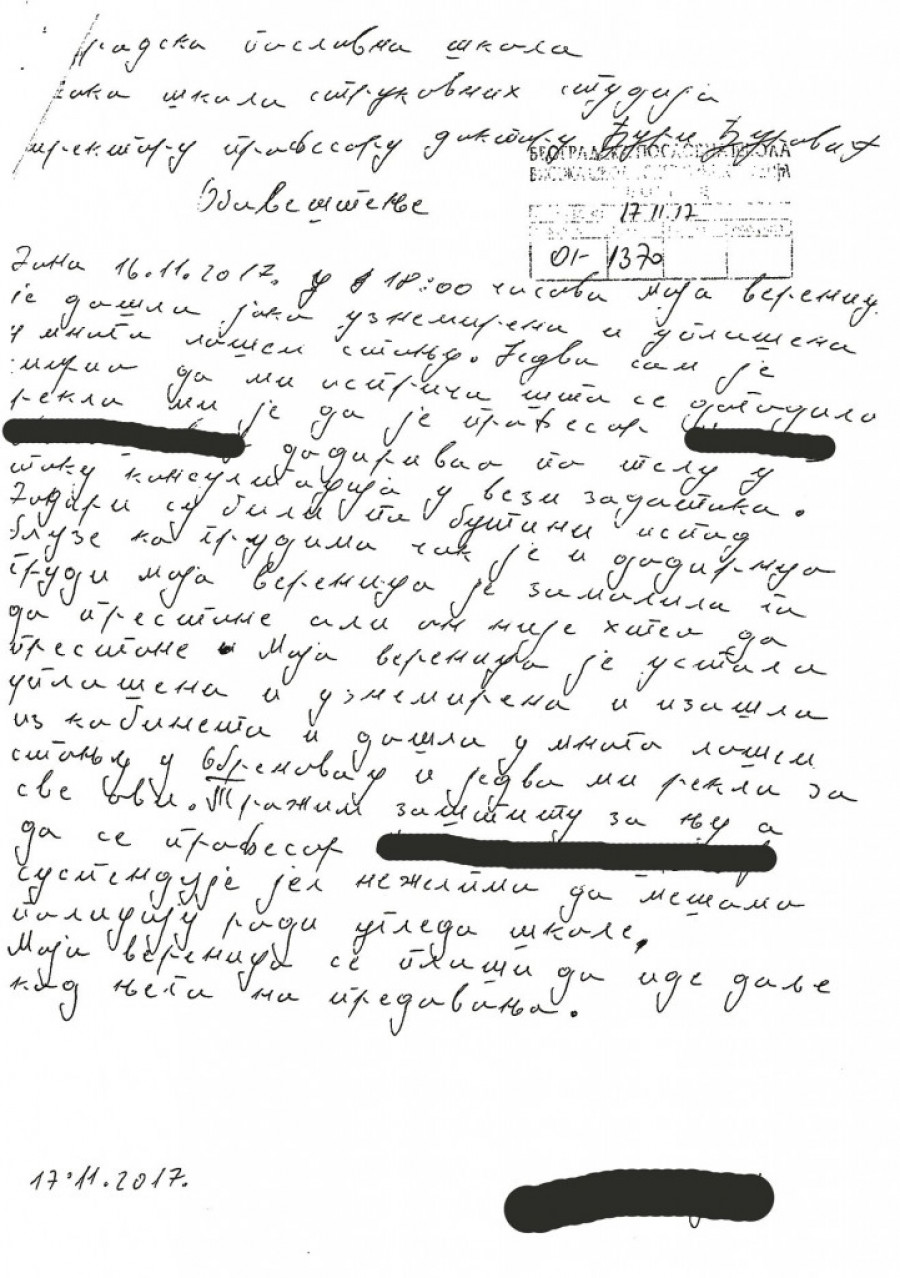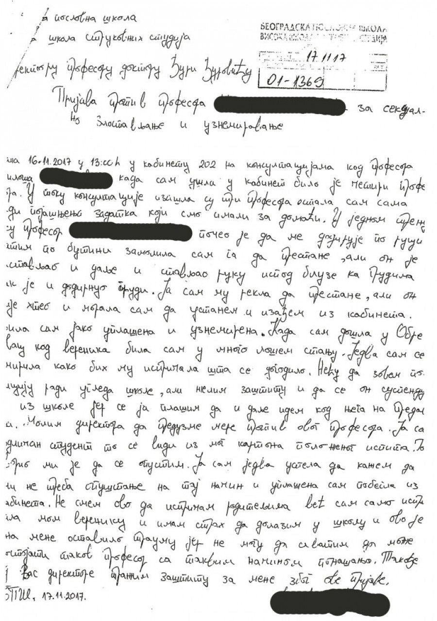 - U jednom trenutku profesor je počeo da me dodiruje po ruci, a zatim i po butini. Govorila sam da prestane, ali on je nastavio dalje i stavio ruku ispod moje bluze, dodirujući me po grudima. Govorila sam mu da stane, ali nije vredelo, pa sam ustala i izašla iz kabineta. Kada sam došla kod verenika, bila sam u mnogo lošem stanju. Jedva sam se smirila kako bih mu ispričala šta se dogodilo - navodi studentkinja.