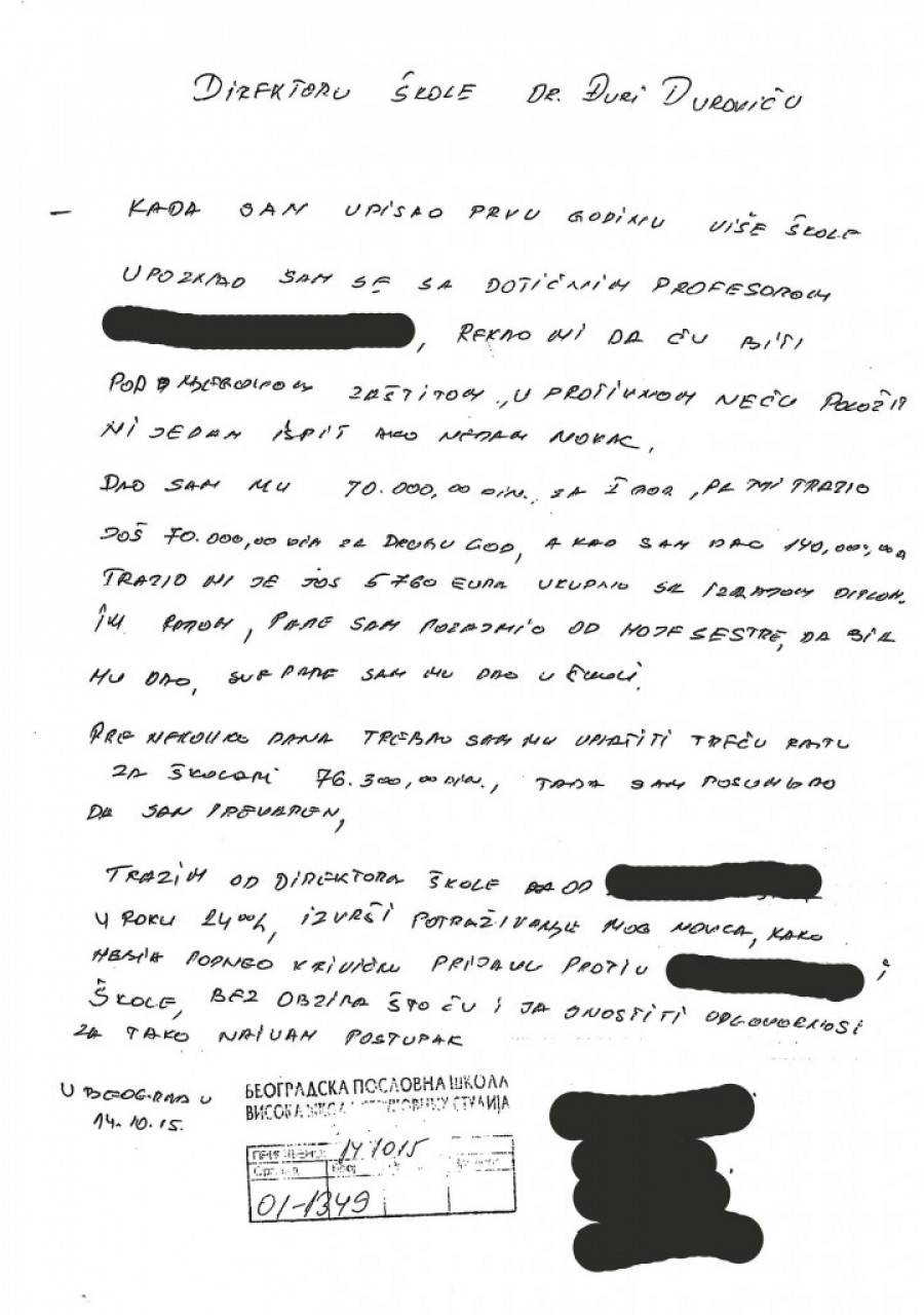 - Dao sam mu 70.000 dinara, pa mi je tražio još toliko za drugu godinu. A kad sam mu dao 140.000, onda mi je tražio još 5.760 evra ukupno, sa izradom diplome. Pare sam pozajmio od sestre i sve sam mu dao u školi - piše student, koji je profesora prijavio upravi škole. Isto je učinio i momak studentkinje koju su uputili na pomenutog profesora, kada je zapela sa nekim ispitima. - Posle prvog razgovora sam mu predao indeks da bi on pogledao u školi kako može da mi pomogne. Drugi put smo se našli kada mi je rekao da ću morati da mu dam 800 evra kao protivuslugu. Treći put kada smo se našli dao sam mu pare da završi ispite. Posle toga je prestao da se javlja - stoji, između ostalog, u ovoj prijavi. |