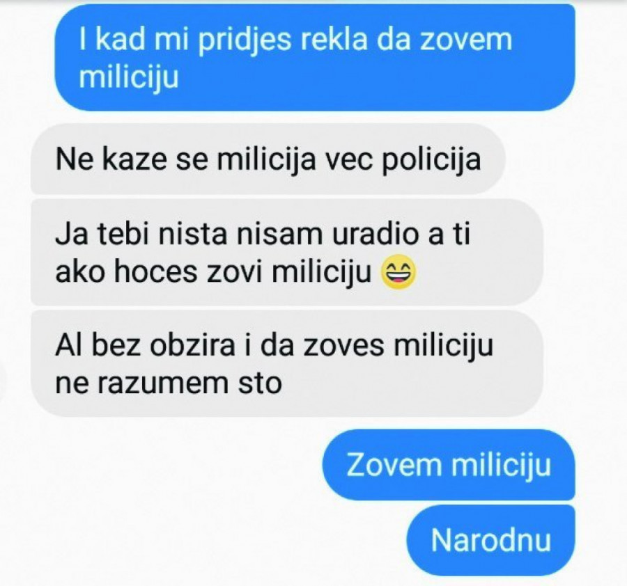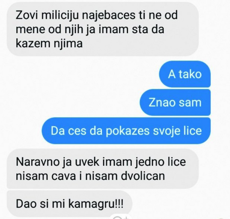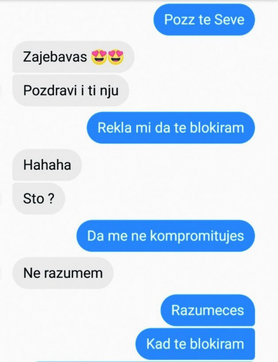 Foto: ST/N. PANČIĆ"Pozz te Seve, rekla mi je da te blokiram, da me ne kompromituješ i da zovem policiju kad mi priđeš", napisao je kreator, na šta mu L. J. odgovorio: "Zovi miliciju, najebaćeš ti, ne od mene, od njih, jer imam šta da im kažem".