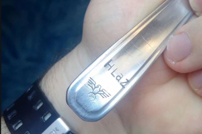 Na Fejsbuku je osvanula fotografija na kojoj se sasvim jasno vidi da na ovom priboru za jelo stoji utisnut žig na kojem piše HLAZ i ispod njega nacistički orao s kukastim krstom.