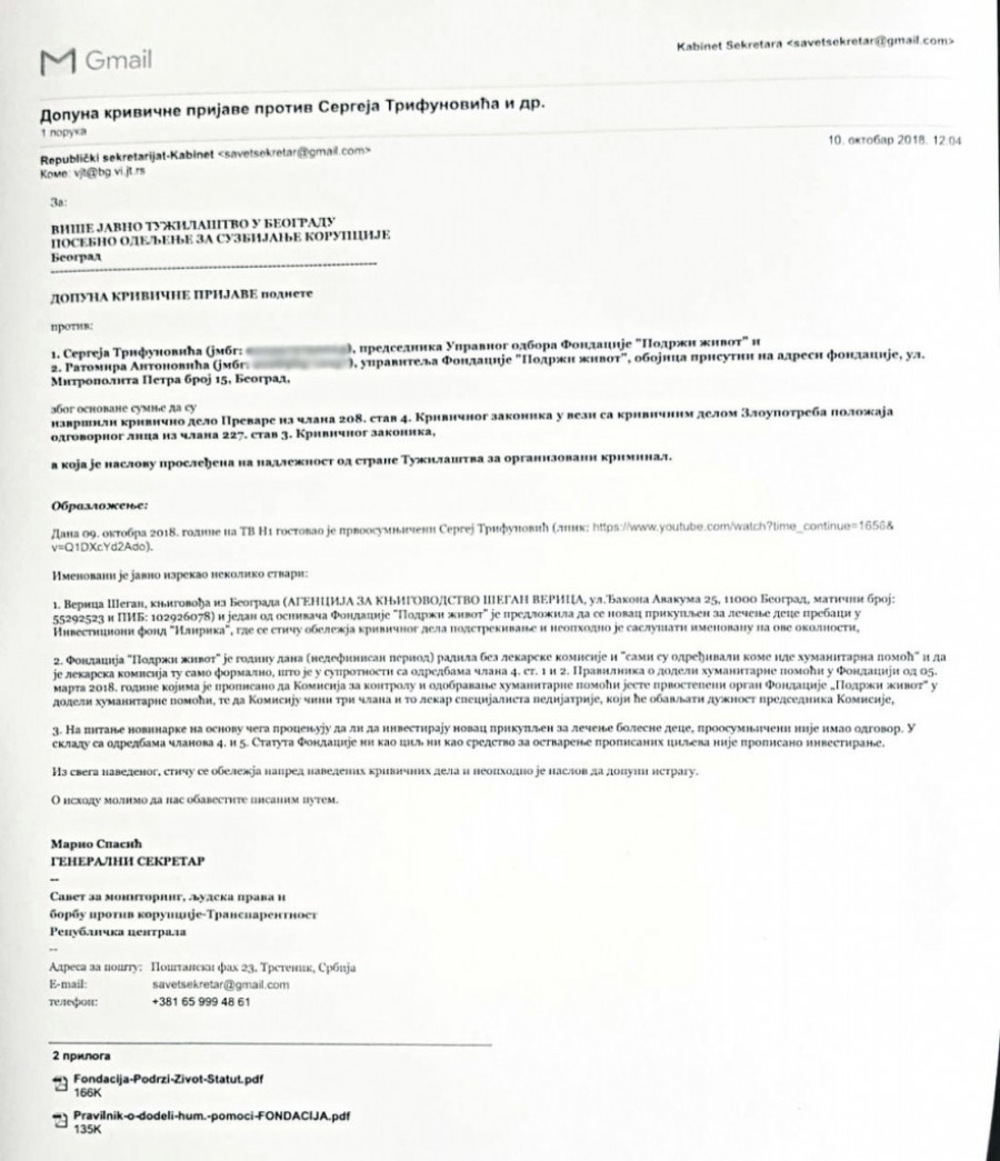 - Zahvaljujem gospodinu Trifunoviću, koji je prilikom nedavnog gostovanja na jednoj televiziji dao potvrdu svih navoda o mogućim zloupotrebama i manipulisanju novcem građana Srbije, koji je prikupljan za lečenje bolesne dece. Shodno tome, dostavili smo dopunu krivične prijave u vezi sumnji u zloupotrebe u fondaciji - poručio je generalni sekretar ove organizacije Mario Spasić.