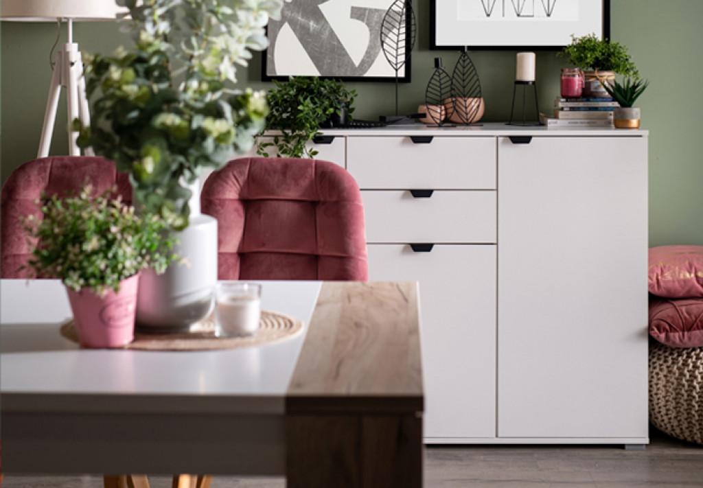 Komoda SARDINIA 3K4F odlično se uklapa uz zid u zelenoj boji, a na njenu gornju površinu možete da postavite biljke, ali i razne druge sitnice.