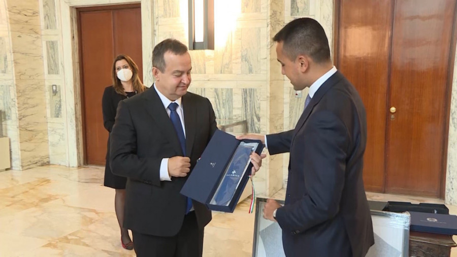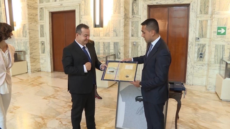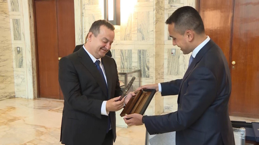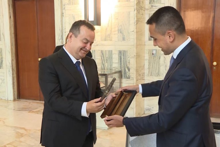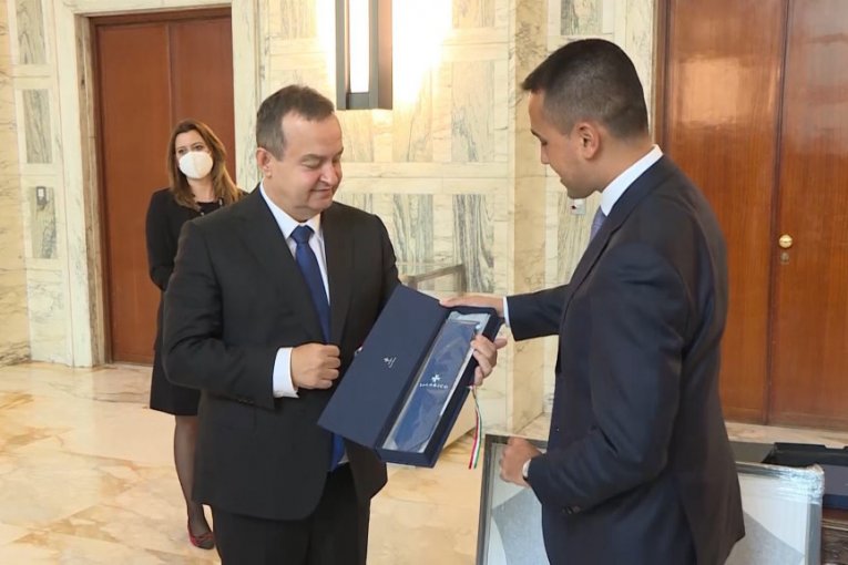 Prvi potpredsednik Vlade i ministar spoljnih poslova Republike Srbije Ivica Dačić i ministar za spoljne poslove i međunarodnu saradnju Italije Luiđi Di Majo razmenili su danas poklone posle sastanka u Rimu gde Dačić boravi u jednodnevnoj poseti.