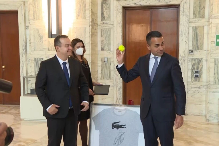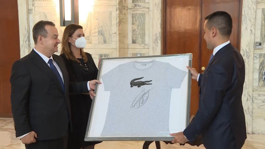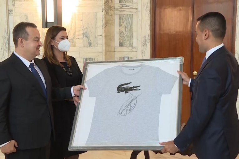 Foto: Ministarstvo spoljnih poslovaŠef srpske diplomatije poklonio je italijanskom kolegi majicu i tenisku lopticu sa potpisom srpskog tenisera Novaka Đokovića naglasivši da je to specijalno za njega.