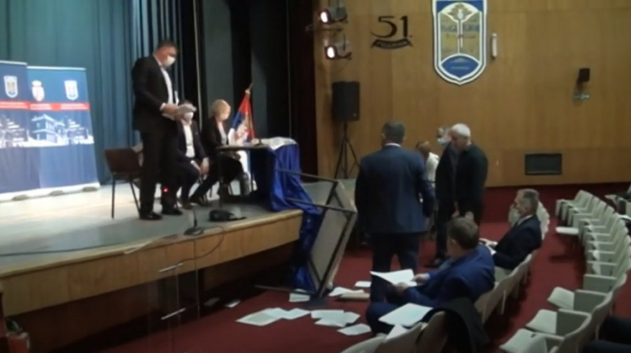 Najpre su odbornici na čelu sa bivšim predsednikom opštine Dimitrijem Paunovićem izašli i blokirali govornicu, a zatim su porušili stolove za kojim sede predsedavajući, njegov zamenik i sekretar skupštine.
