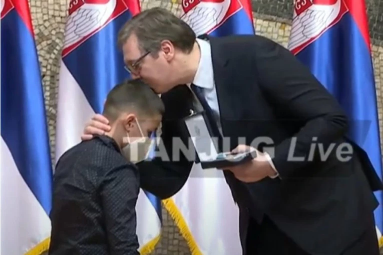 Odlikovanje je primio njegov sin, mali Uroš, a predsednik Vučić je dečaka pomazio i poljubio u glavu.
