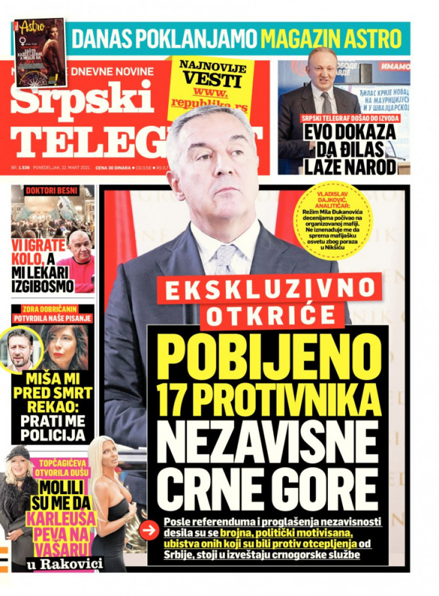 - Ne bih se usudio da pričam o politički motivisanim ubistvima bez dokaza u svojim rukama, ali bih sa sigurnošću mogao da kažem da je režim Mila Đukanovića decenijama počivao na jako organizovanoj mafiji. S tim u vezi, ne iznenađuju me naslovi pojedinih medija da Đukanović sprema mafijašku osvetu zbog poraza u Nikšiću.