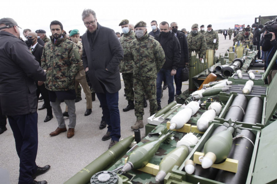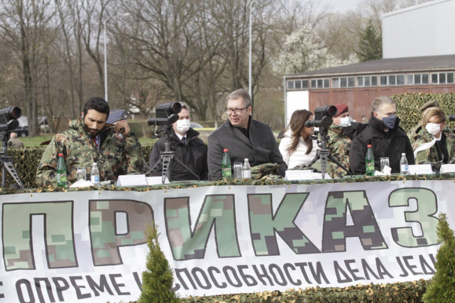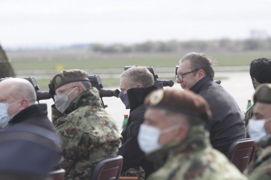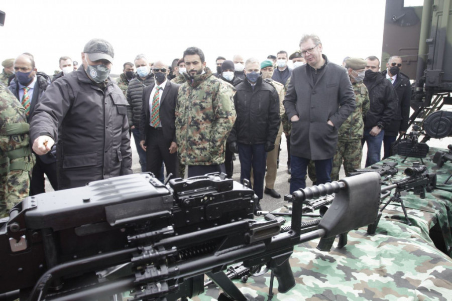 Predsednik Srbije Aleksandar Vučić i šeik Naser bin Hamad bin Isa Al Kalifa, sin i izaslanika kralja Bahreina za humanitarni rad, pitanja omladine i savetnika za nacionalnu bezbednost prisustvuju prikazu naoružanja, vojne opreme i sposobnosti dela jedinica Vojske Srbije na Vojnom aerodromu "Pukovnik Milenko Pavlović" u Batajnici.