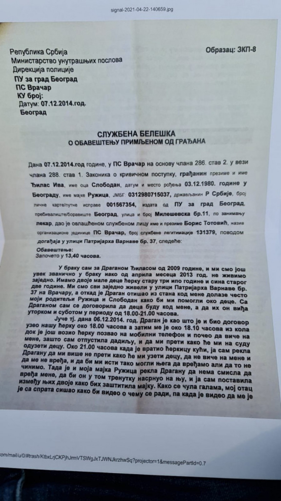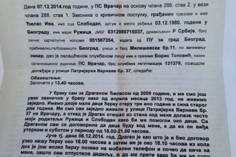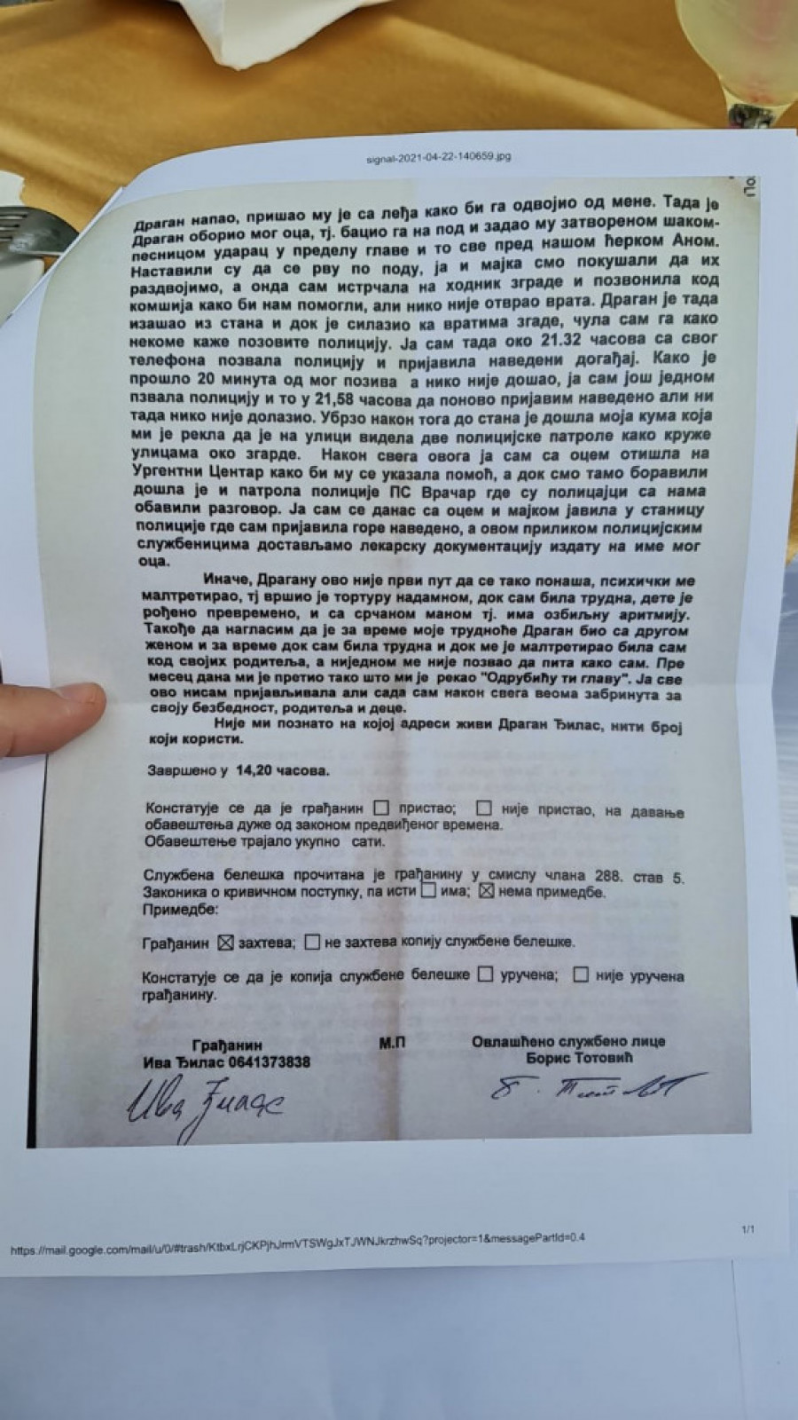 - Samo ću da kažem: "Kako se čula galama, moj otac je sišao sa sprata", da ne čitam... Dalje kaže da ga je Dragan Đilas oborio i otvorenom šakom udario u glavu ispred dece i rekao je da će joj odrubiti glavu. To je Dragan Đilas rekao supruzi Ivi Đilas. To je jedan od razloga.